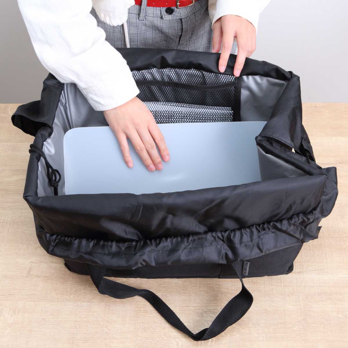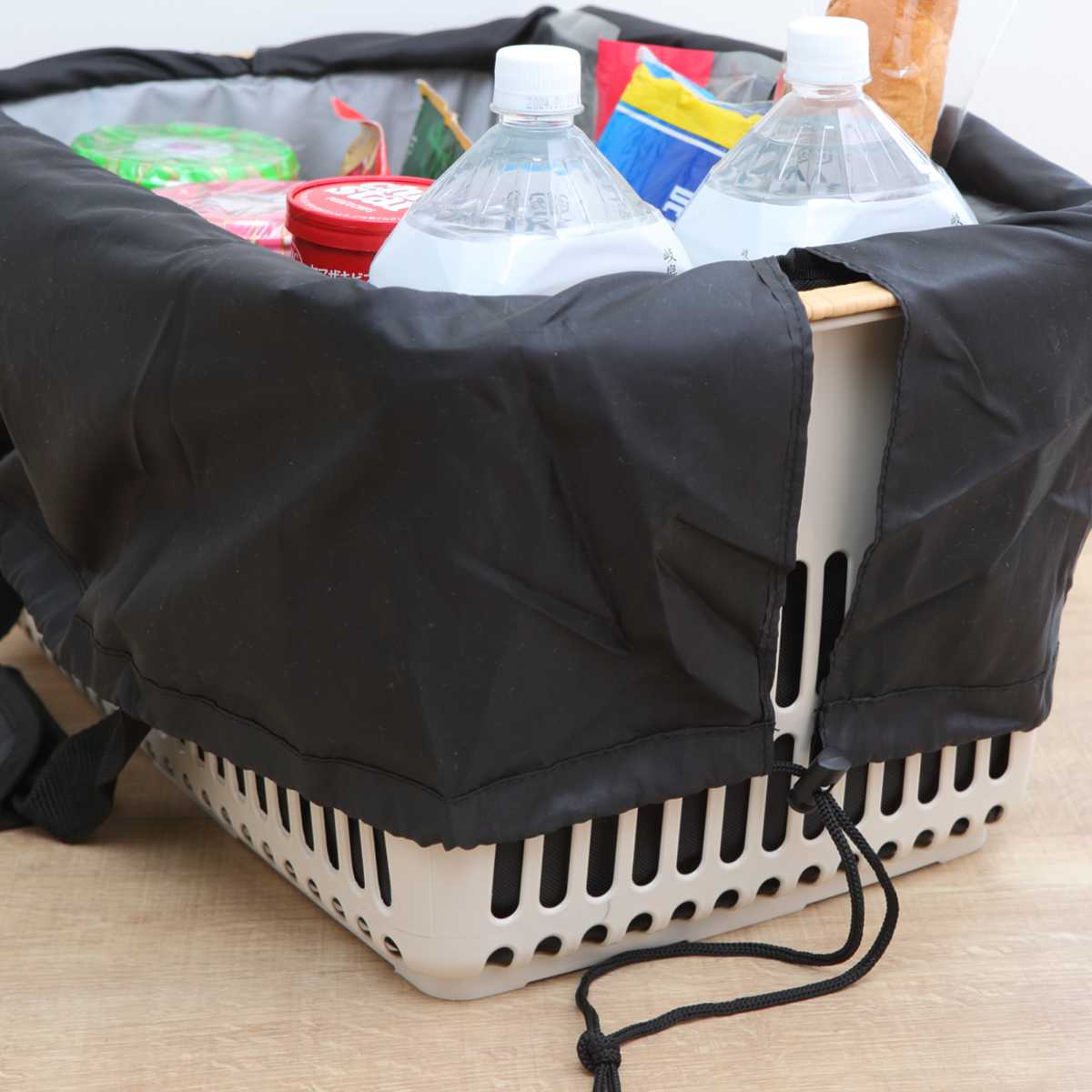 巾着タイプなので、荷物が多くなっても開口部が空いたままにならず、中に入れた物がはみ出たり、落ちたりせずに収納した物を守ります。目隠しとしても大活躍。また、冷気を逃しにくい効果もあります。