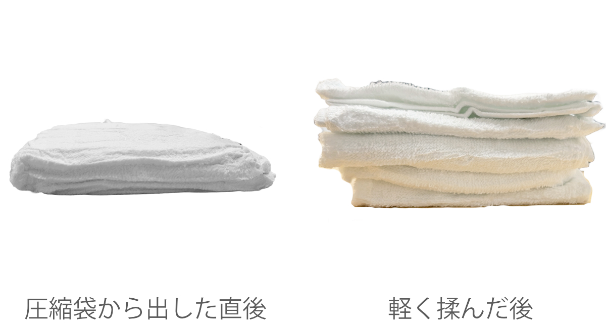 ぎゅっと圧縮されているので軽く揉めば柔らかい手ざわりのタオルになります。サイズも34×80cmと大きめなので、フェイスタオルとしてはもちろん、手や体を拭くのにも便利なサイズです。