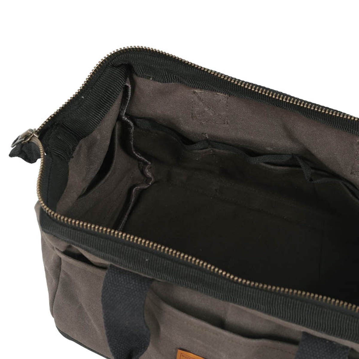 プロの電気工事業者が使用するツールバッグをベースにしたハンドバッグです。ワックス加工が施されたキャンバス生地は、使えば使うほどに味わいが増していきます。