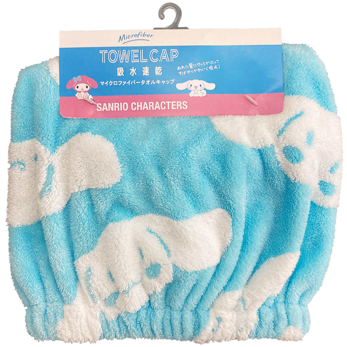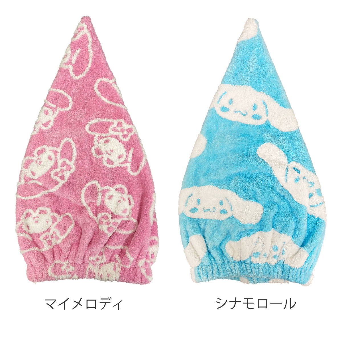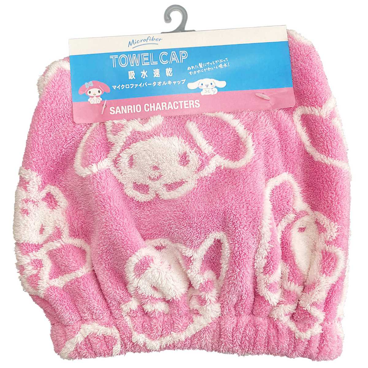 マイメロディ、シナモロールの総柄デザインのタオルキャップです。お風呂上がりや、プールの後の濡れた髪をかわいくまとめることができます。