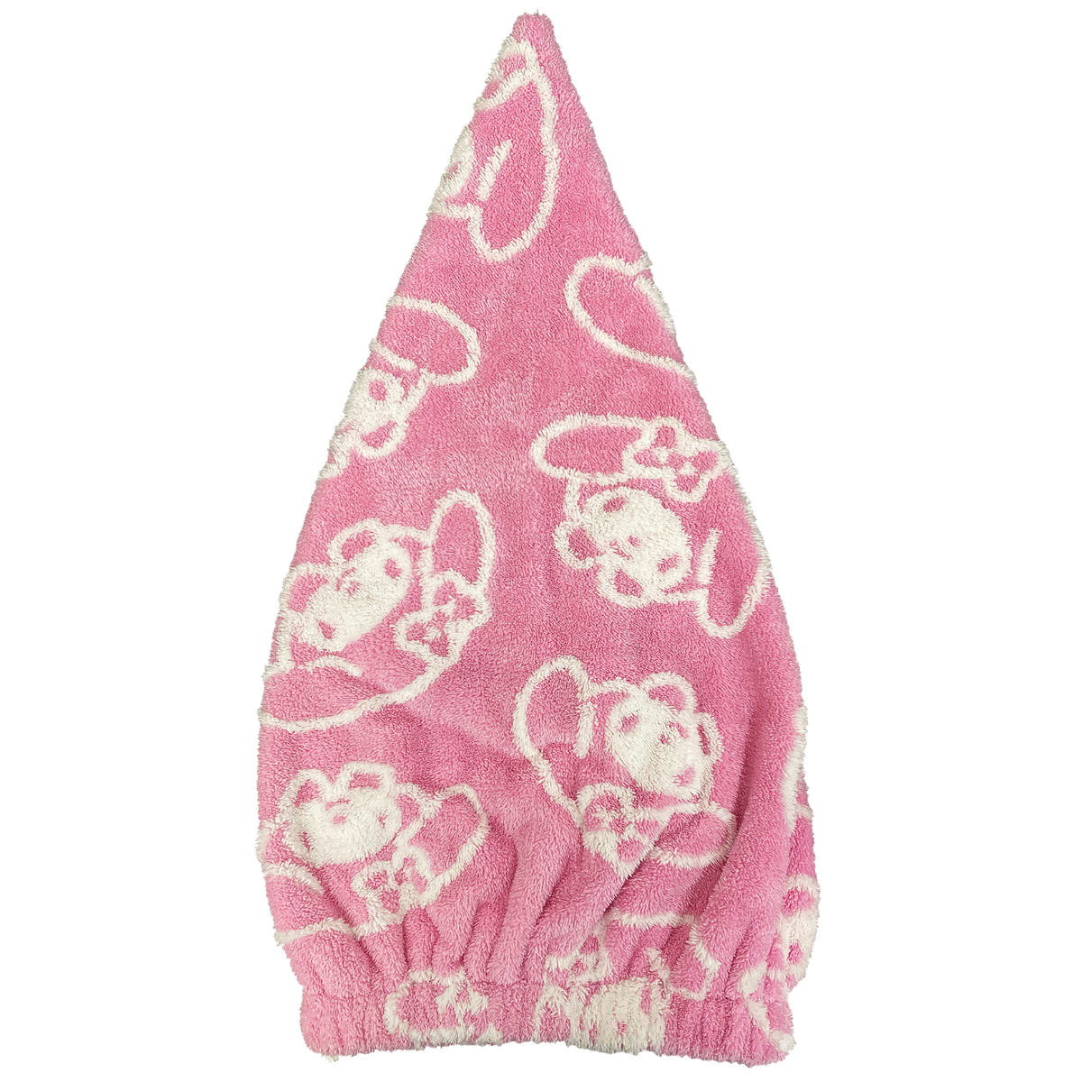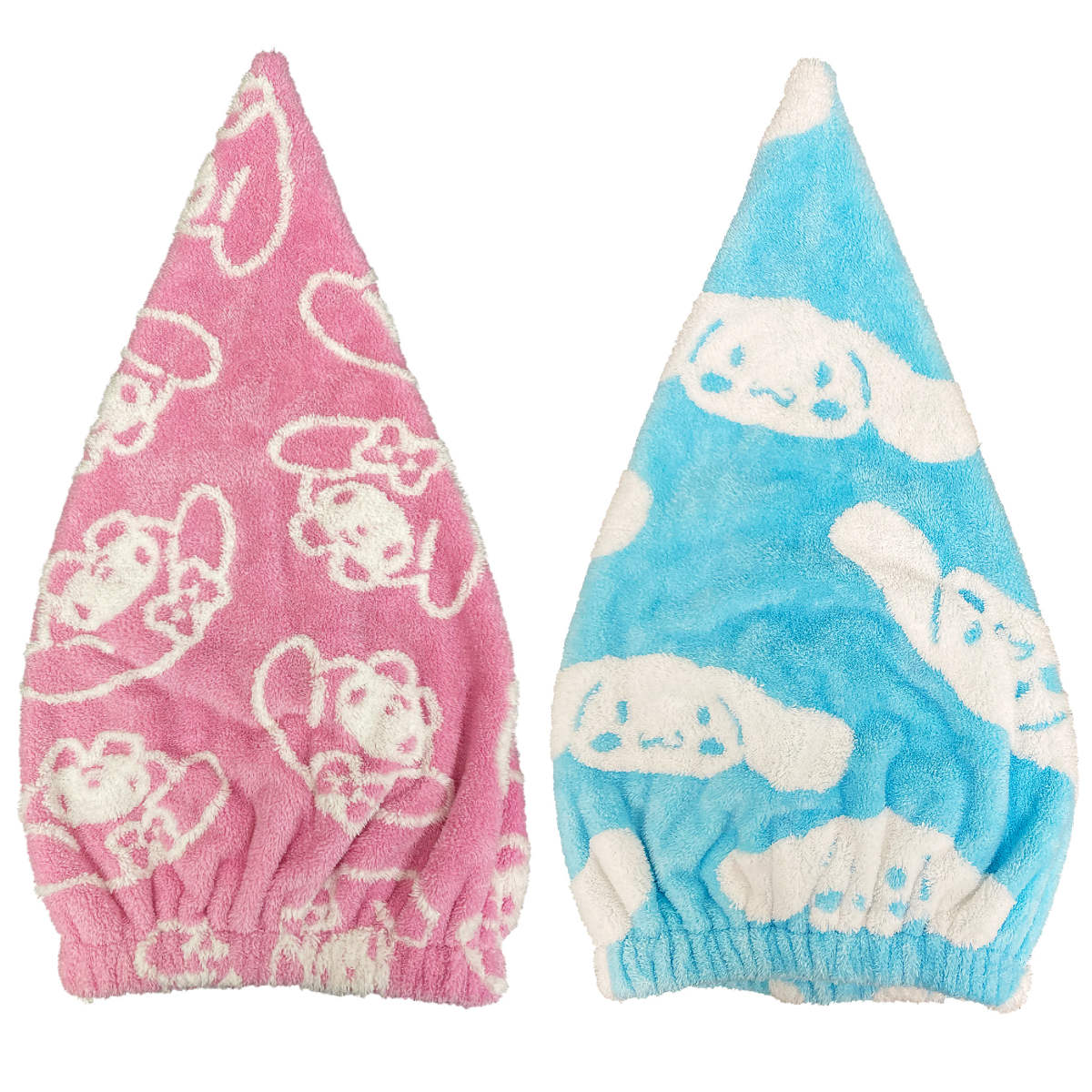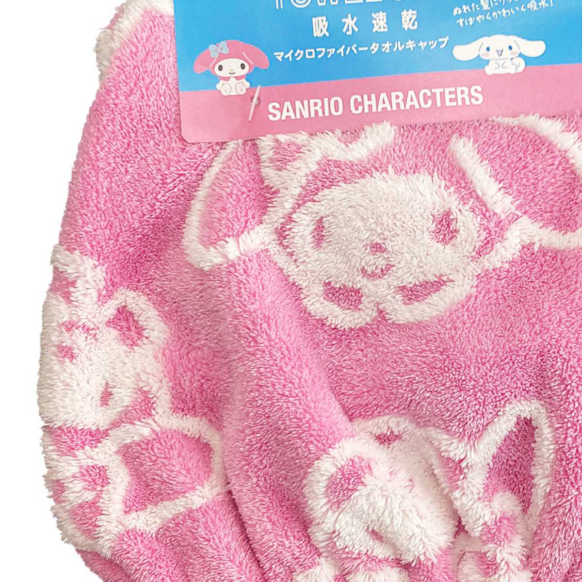 マイメロディ、シナモロールの総柄デザインのタオルキャップです。お風呂上がりや、プールの後の濡れた髪をかわいくまとめることができます。