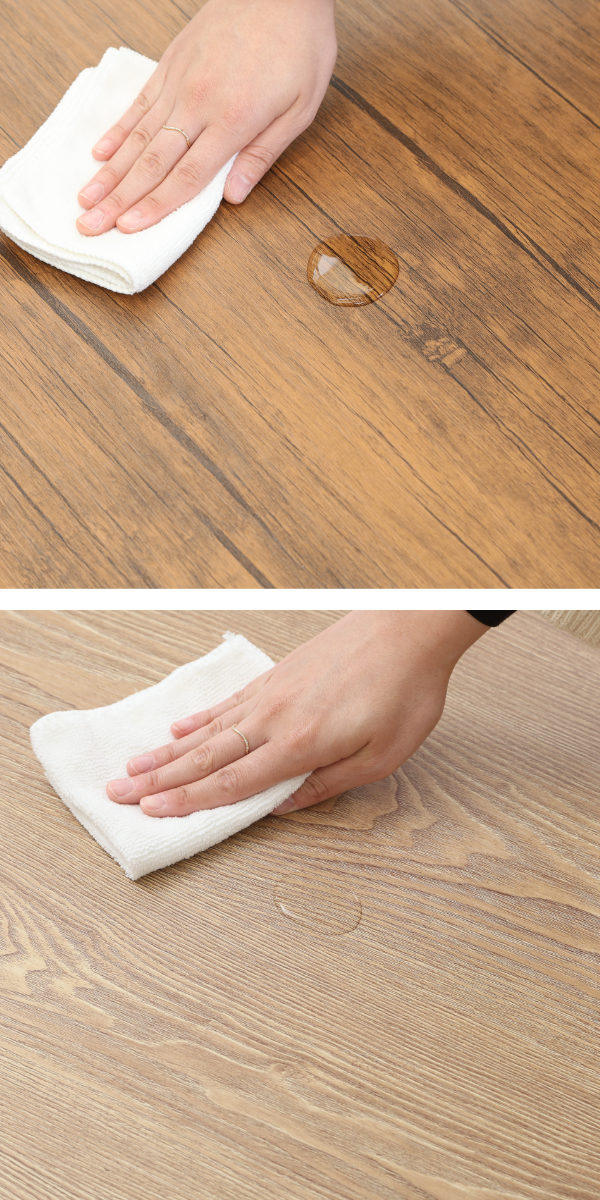 天板の表面は水や汚れに強いPVCシートです。飲み物などをこぼしてもサッと拭くだけでキレイになり、お手入れも簡単です。