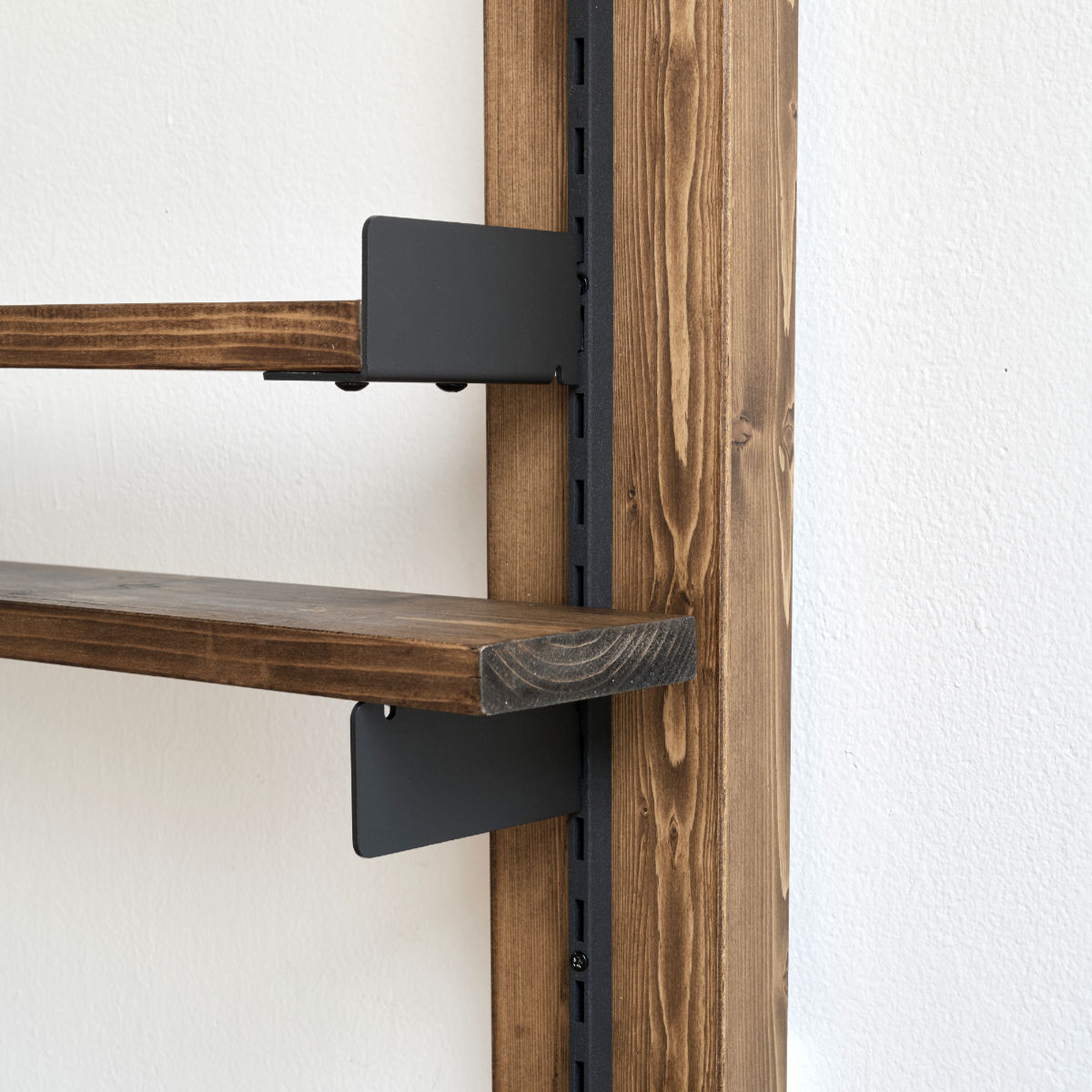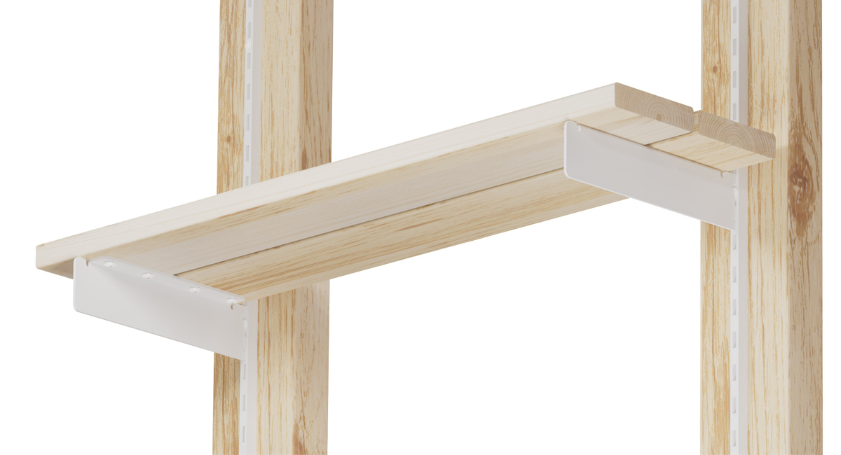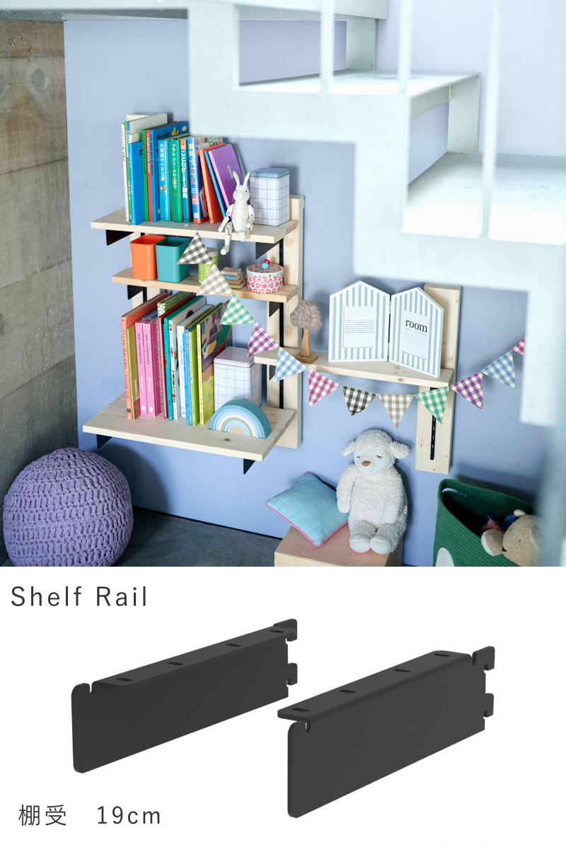 「棚受 19cm」は、1×4材を2枚乗せるだけで簡単に棚が作れます。レールの間隔は2.5cm刻みなので、収納物によって高さを変えることができ、収納したいものが変わっても自由に棚の高さを変えられます。