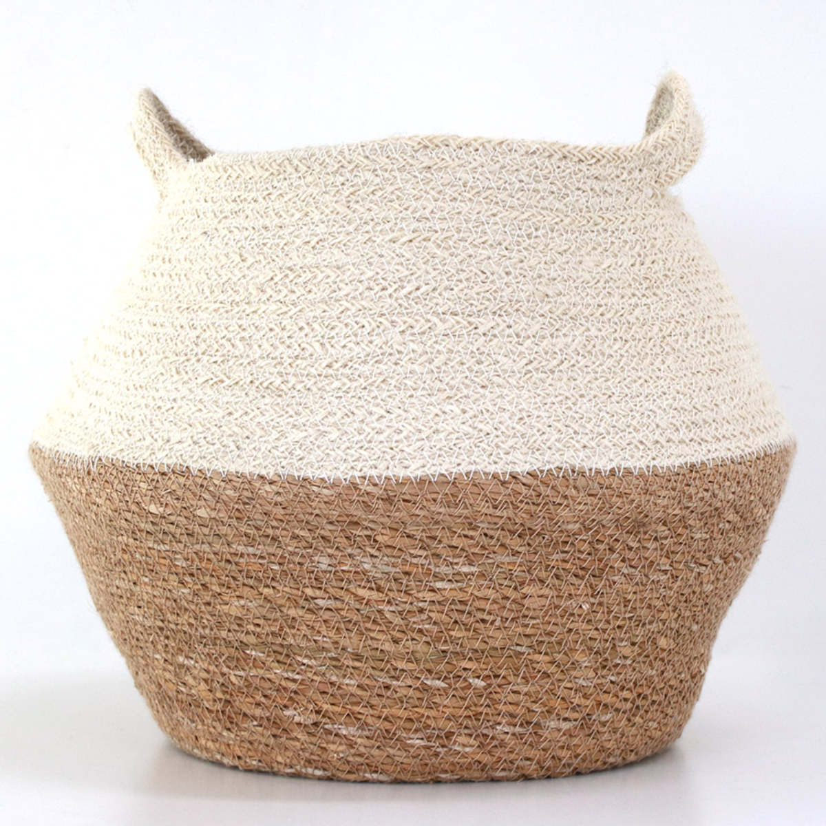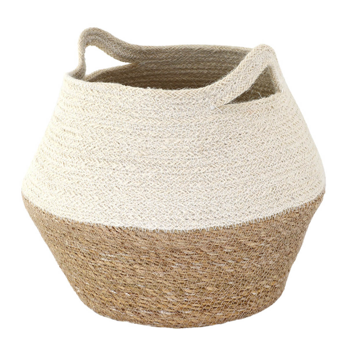 ジュートとシーグラスのコンビネーションが魅力的なバスケットです。天然素材なので通気性がよく、食品ストックや野菜の収納にも適しています。雑貨を入れたり、インテリアとして飾ったりと、アイデア次第でさまざまなシーンで活用できます。