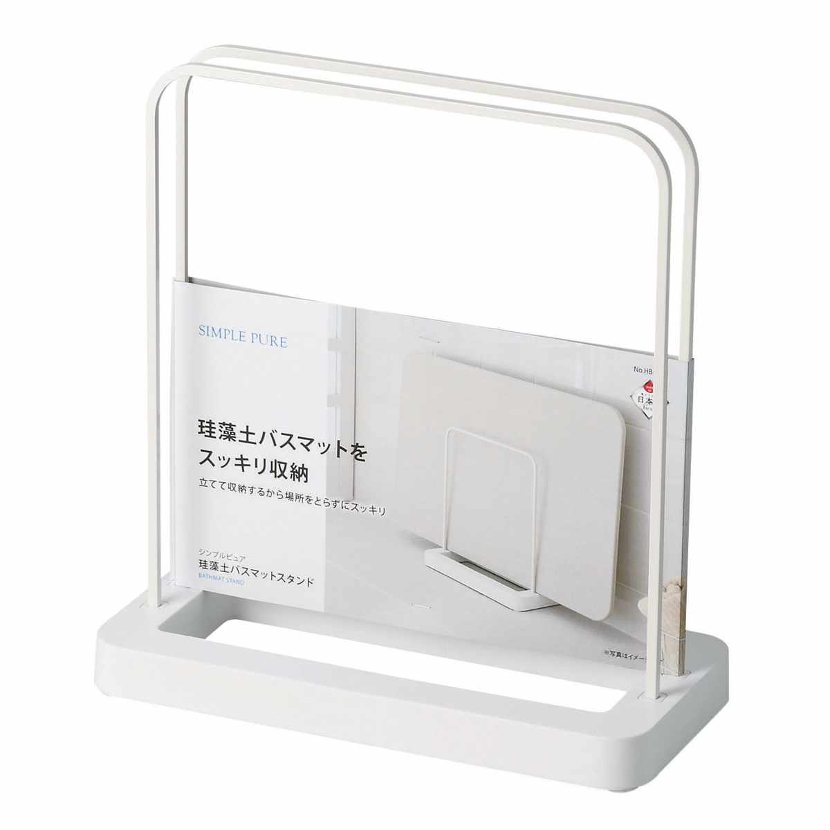 珪藻土バスマットをスッキリ収納できる「シンプルピュア」シリーズ。珪藻土バスマットスタンドと、体重計も一緒に立てられる珪藻土バスマット&体重計スタンドがございます。