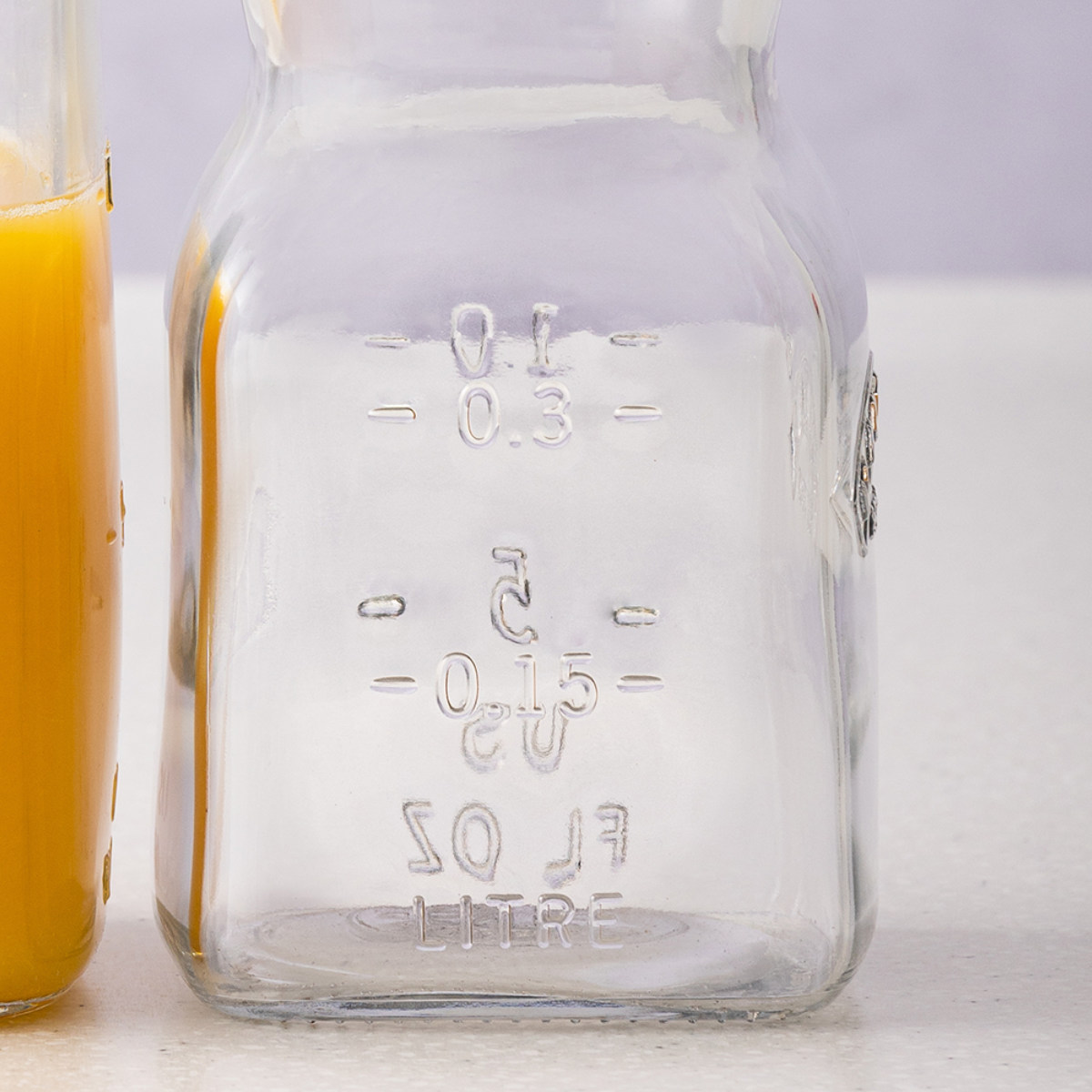 ガラス瓶の四角いフォルムは冷蔵庫のドアポケットにフィットするように設計されており、冷蔵庫内にすっきりと収めることができます。