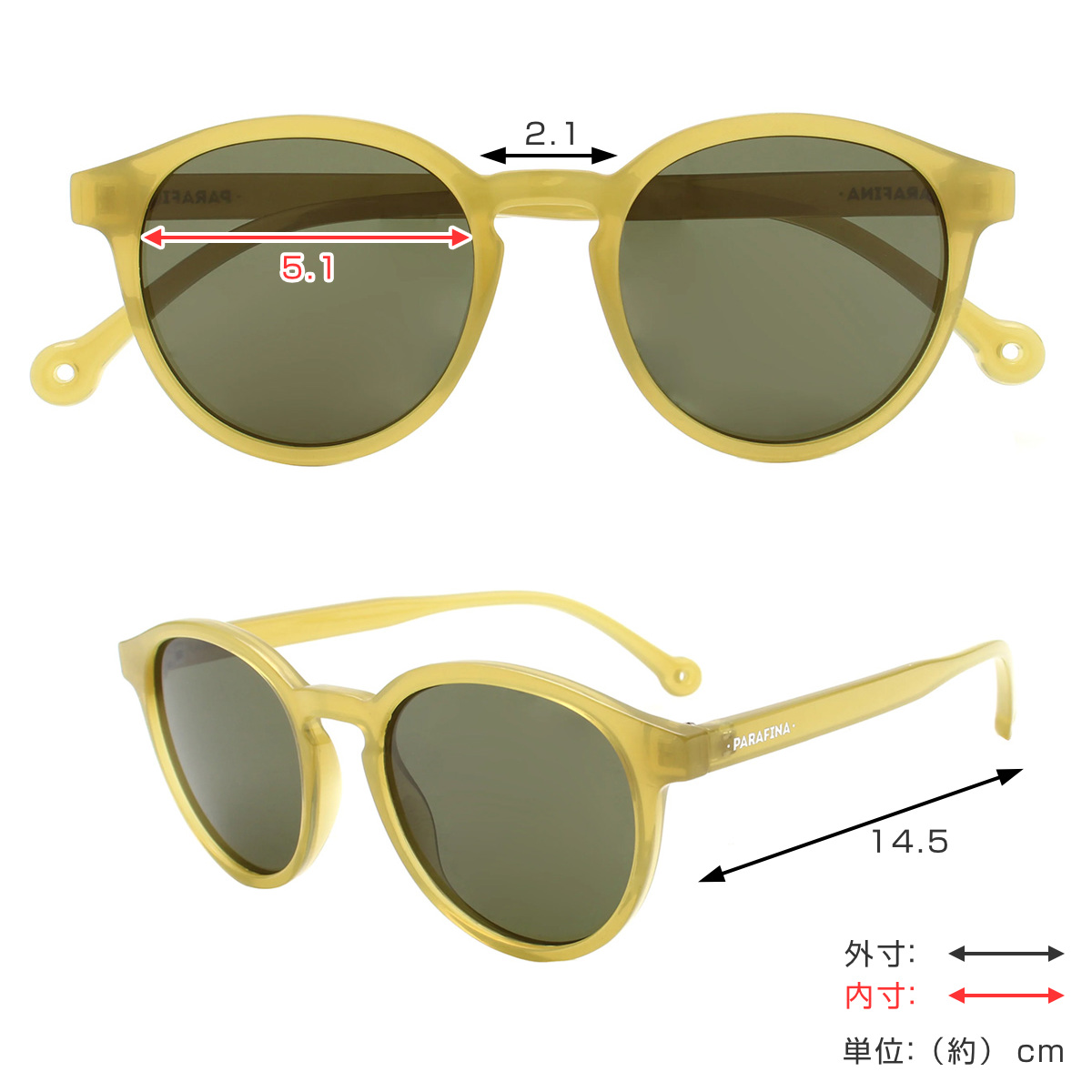 | サイズ | レンズ幅:約 5.1(cm) ブリッジ:約 2.1(cm) テンプル:約 14.5(cm) |