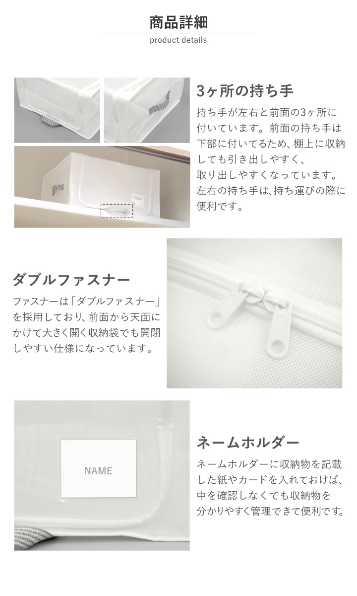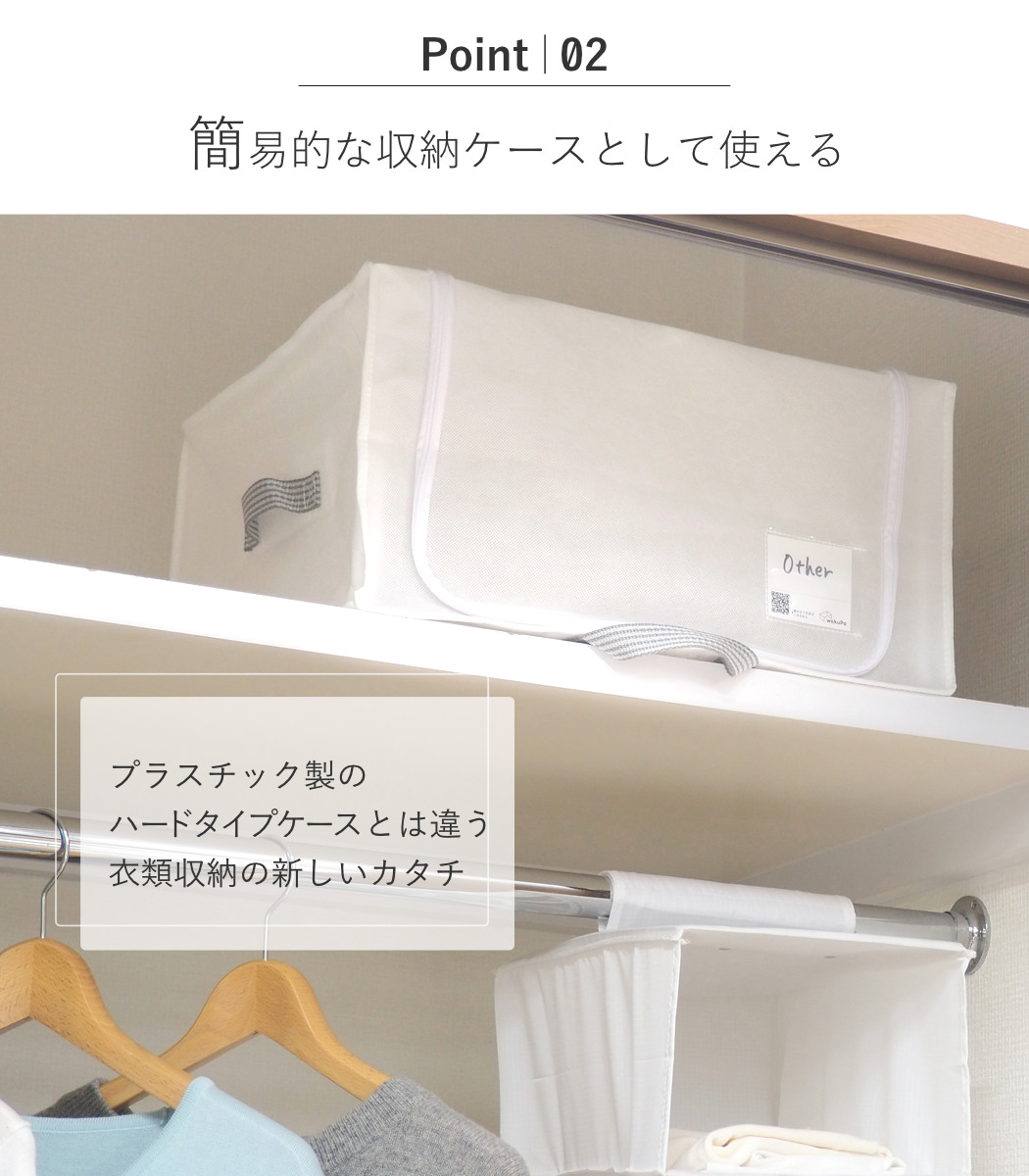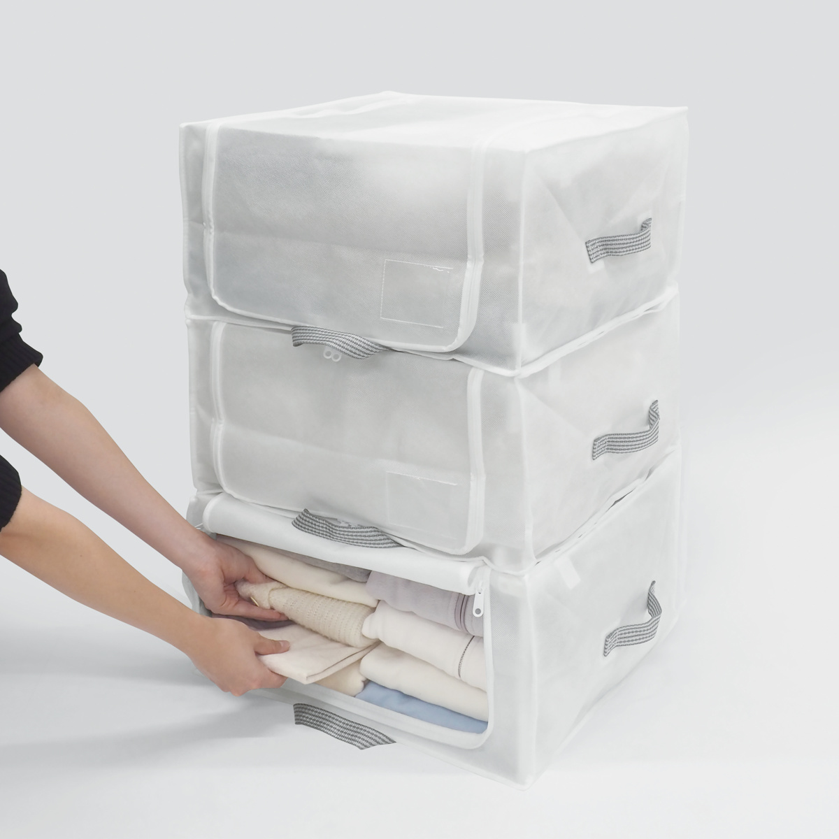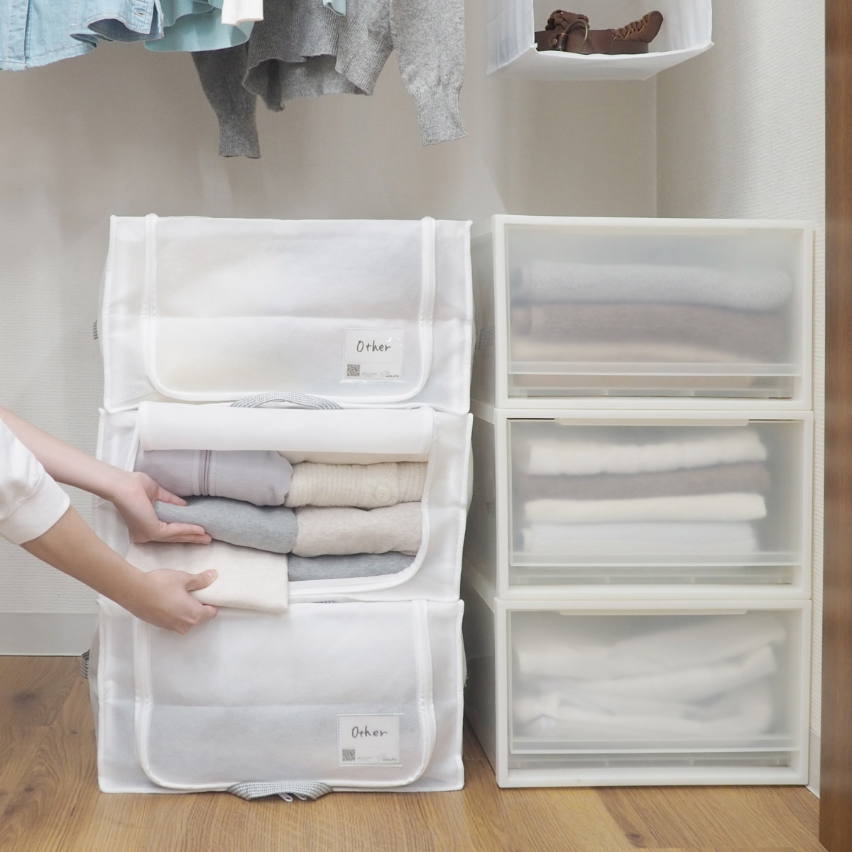 従来の不織布製の柔らかい収納袋の一面を持ちつつも、収納ケースのように積み重ねての使用を可能にした新形態の衣類収納袋です。