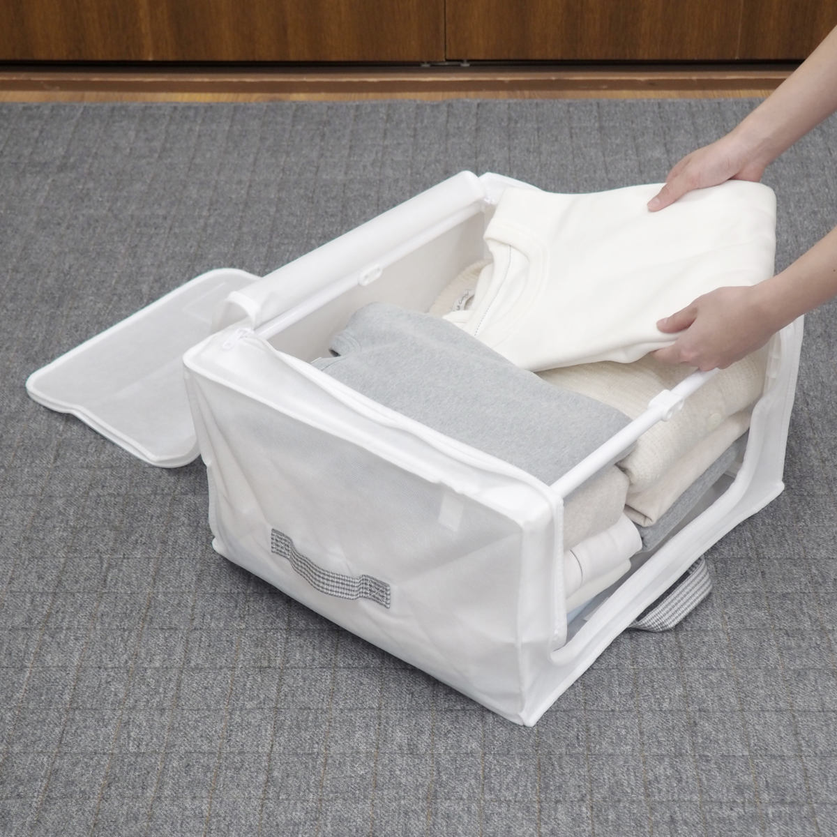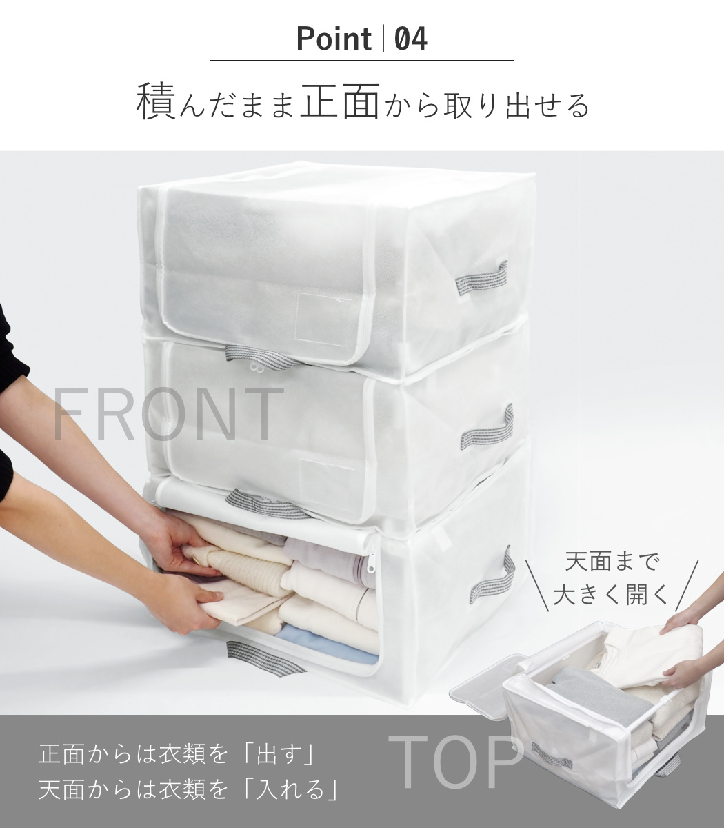 生地製の収納袋は積み重ねると重みでぐちゃっとつぶれて見た目が悪くなり、衣類を取り出す際も上に載っている収納袋をよける必要がありますが、wakuPa(ワクパ)はフレーム付きなので積み重ねても下が潰れることなく形状を維持してくれます。そのため、積み重ねた状態でも前面が開くので下段であっても衣類の取り出しが簡単に行えます。フタは前面から天面にかけてガバっと開くので、出し入れもスムーズです。