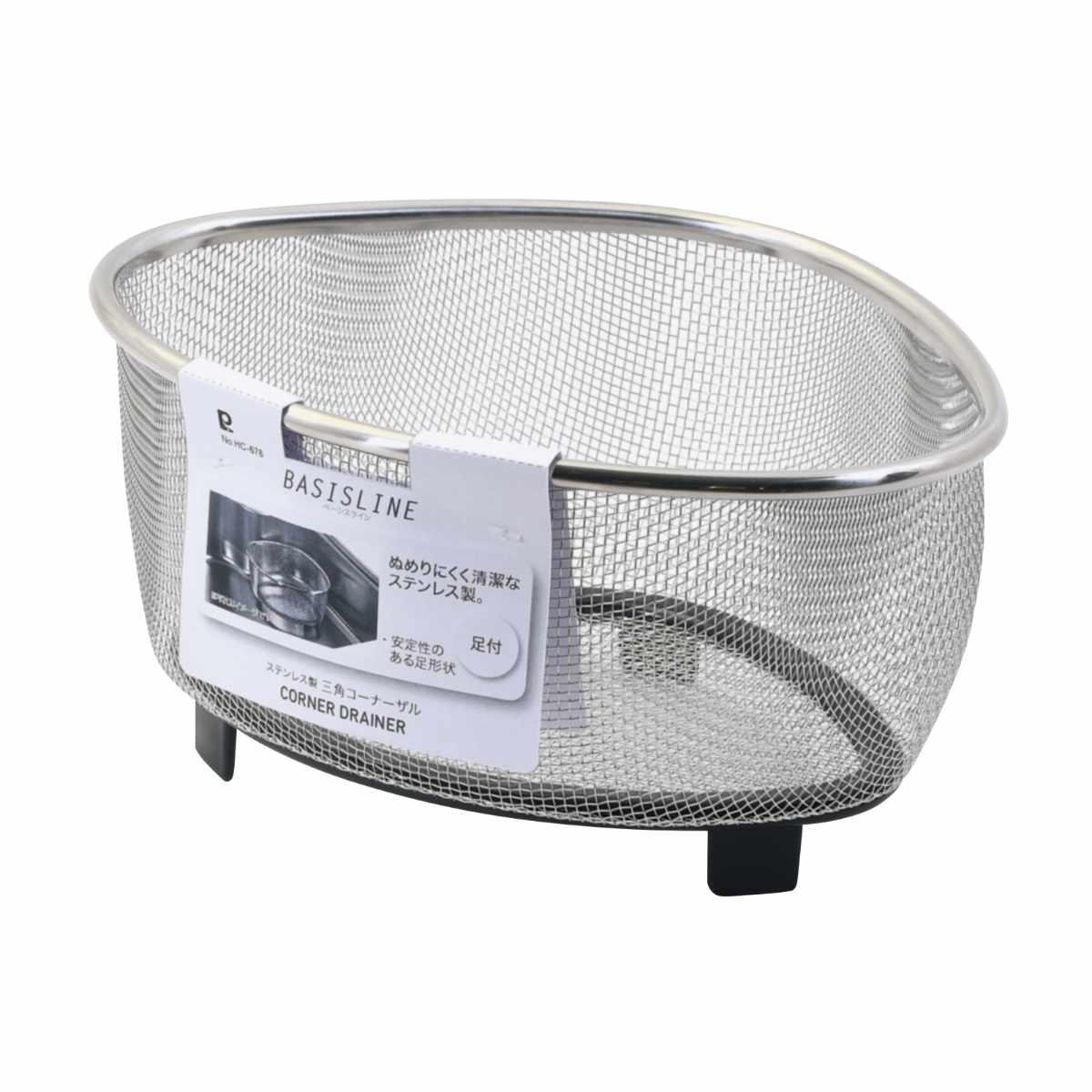 汚れや臭いが付きにくいステンレス鋼製の三角コーナーです。脚高があるので水切れや通気性が抜群で、いやな臭いもこもりにくいです。