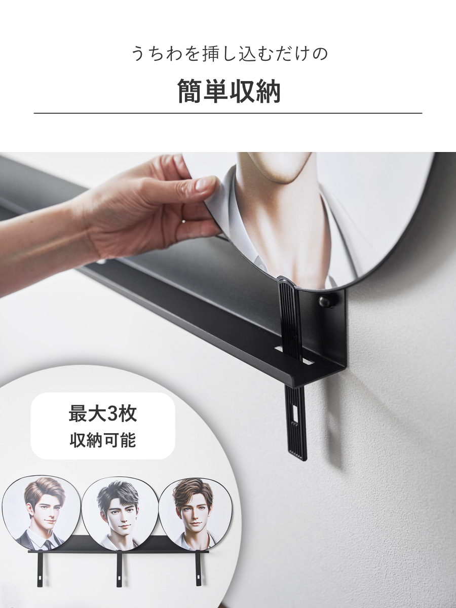 スリット穴があるので、うちわを最大3枚飾れます。差し込むだけの簡単出し入れで、使いたい時にさっと手に取れます。