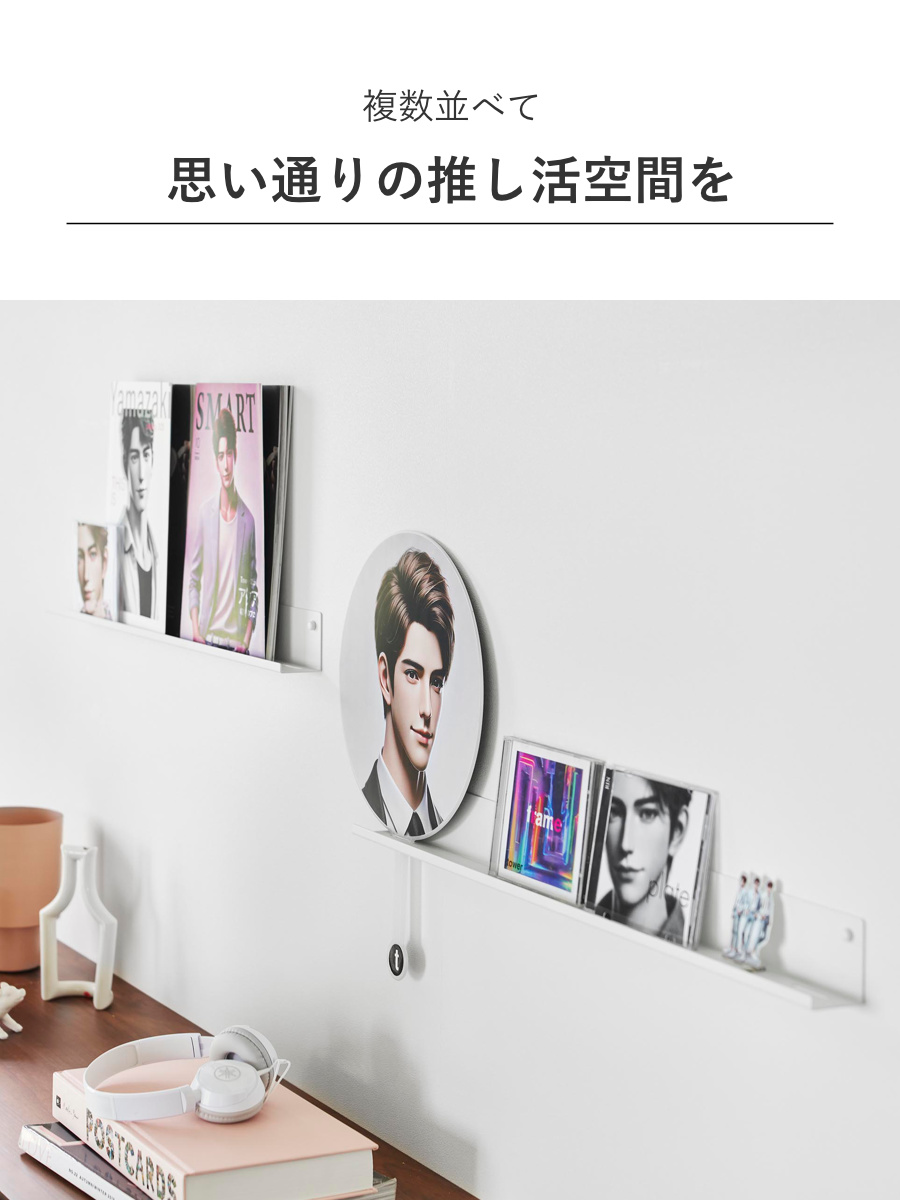推し活のグッズを飾りながら収納できるウォールラックです。奥行き4.5cm以内であればアクリルスタンドもディスプレイできます。収納としてはもちろん、飾ることによっていつでも推しを眺められます。