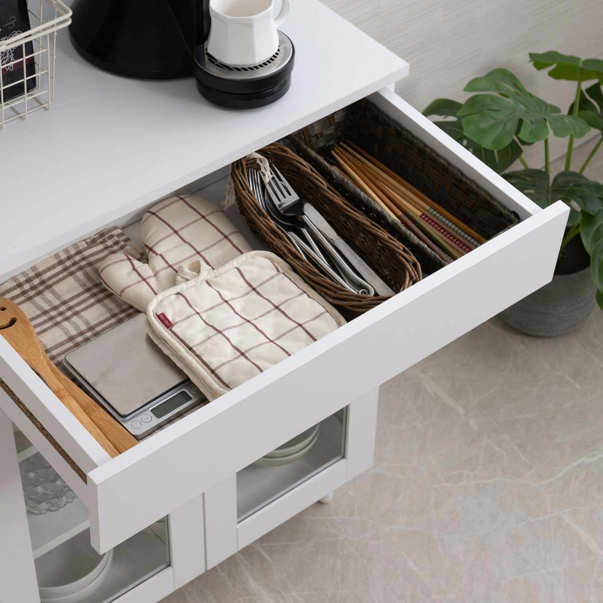 カトラリーや布巾など、キッチン雑貨の整理に便利な引出しが1杯付いています。引出しの下に手掛けがある、シンプルなデザインです。