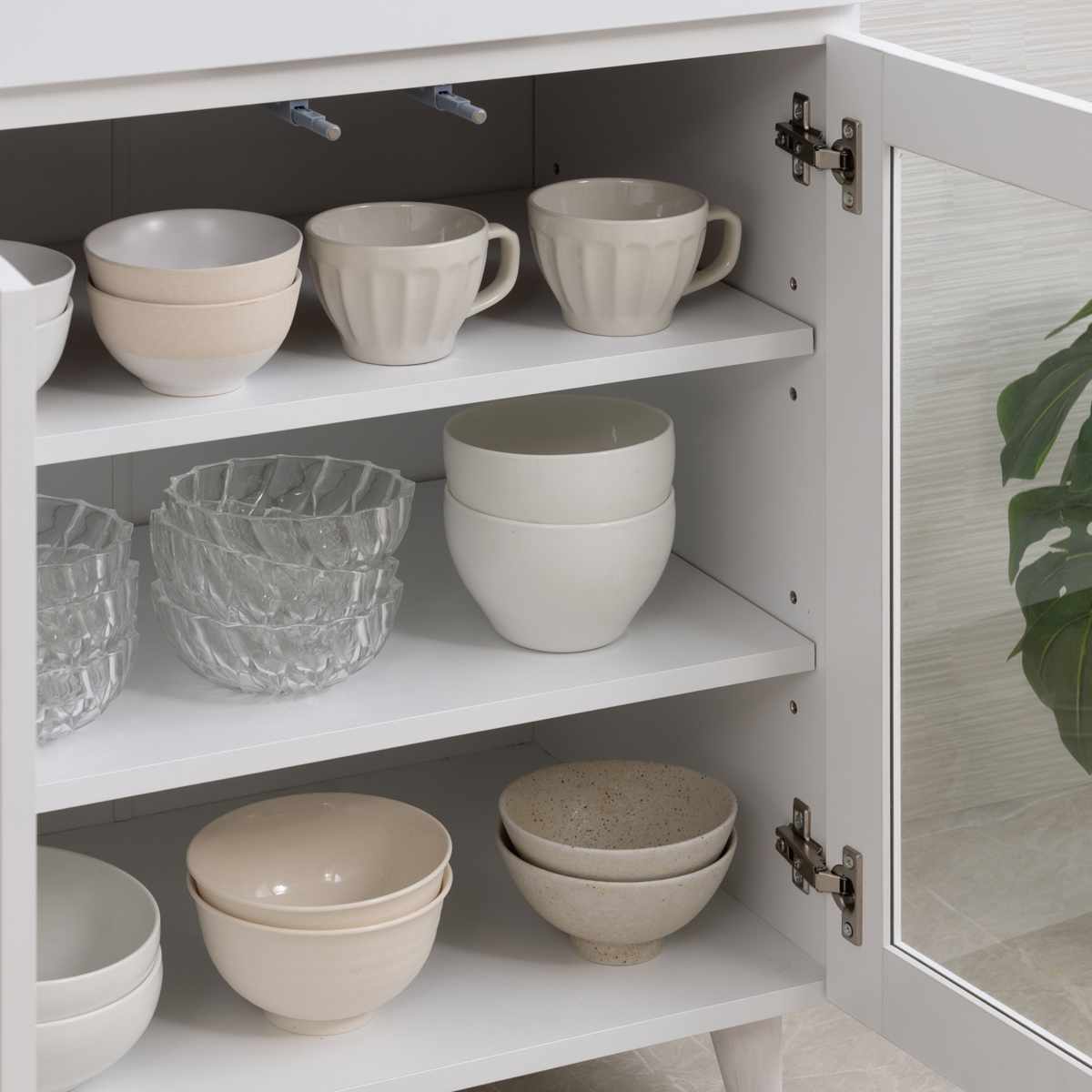 食器などの収納物に合わせて高さを調節できる可動棚が付いています。スペースを無駄にすることなく収納できます。