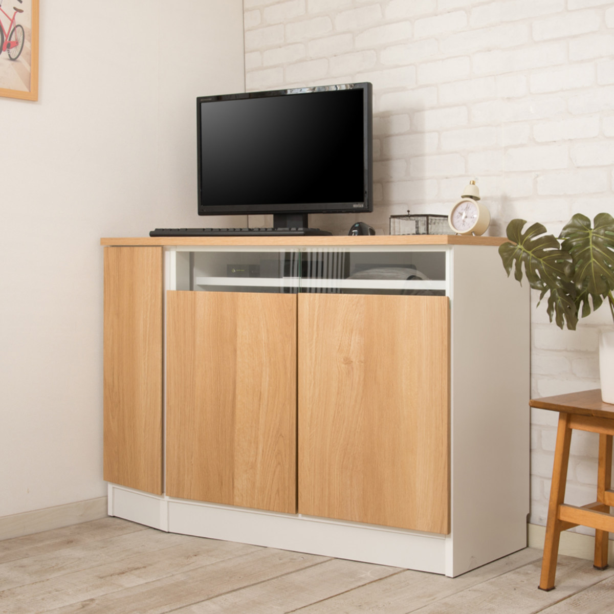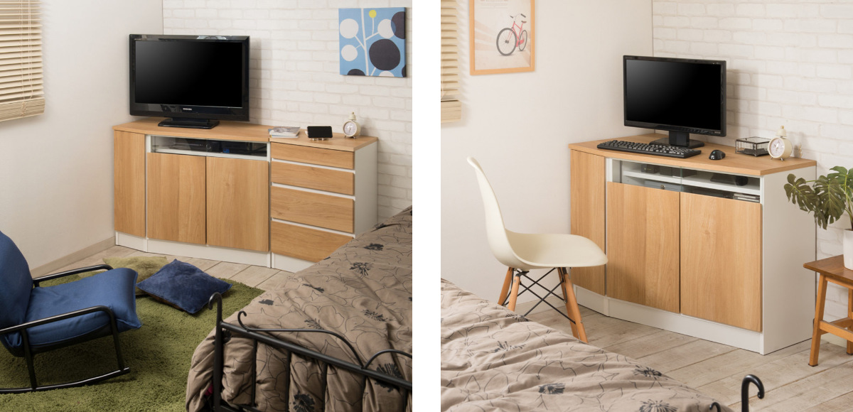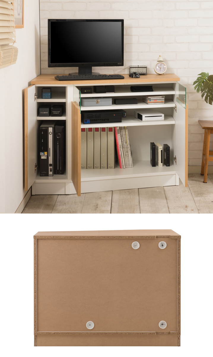 パソコンデスクやテレビボードとしてもお使いいただけます。扉のガラス部分にAV機器を設置すれば、扉を閉めたままリモコンの操作が可能です。