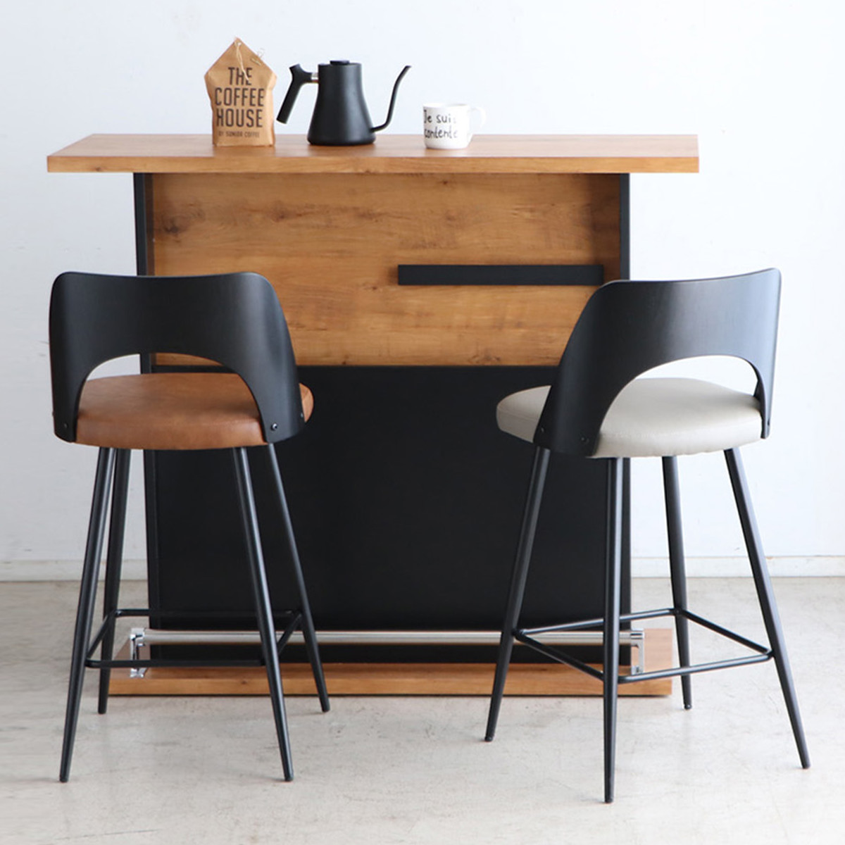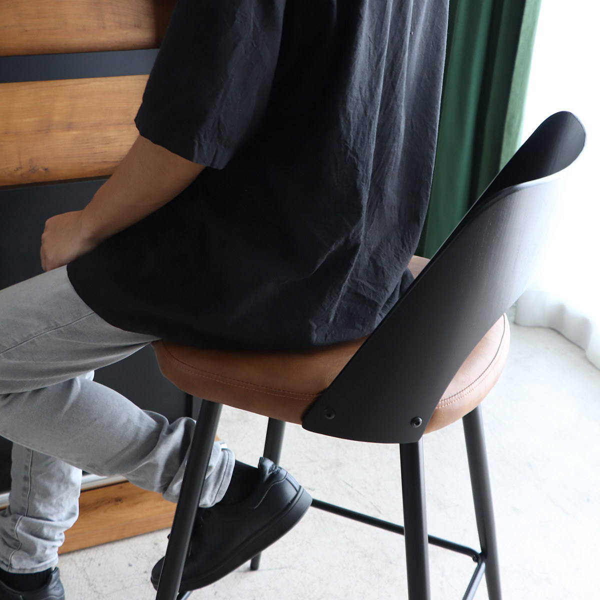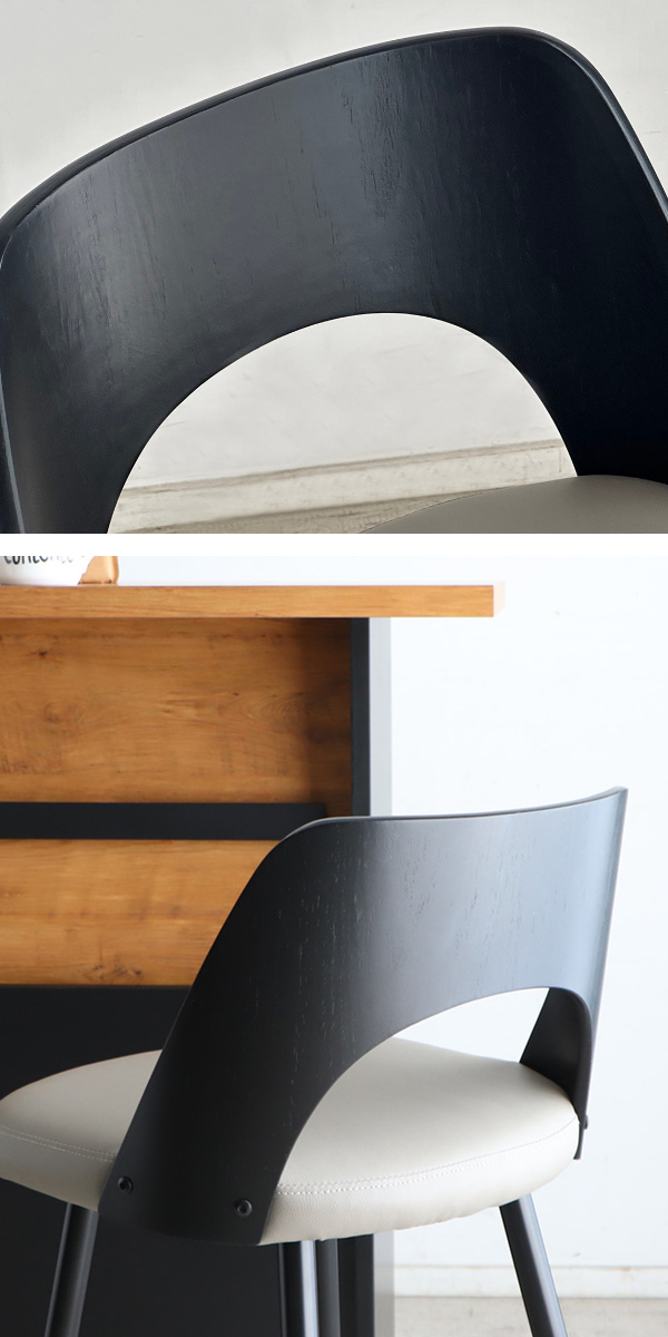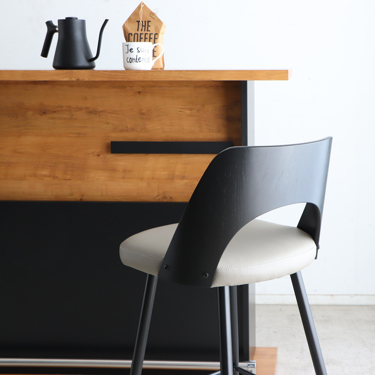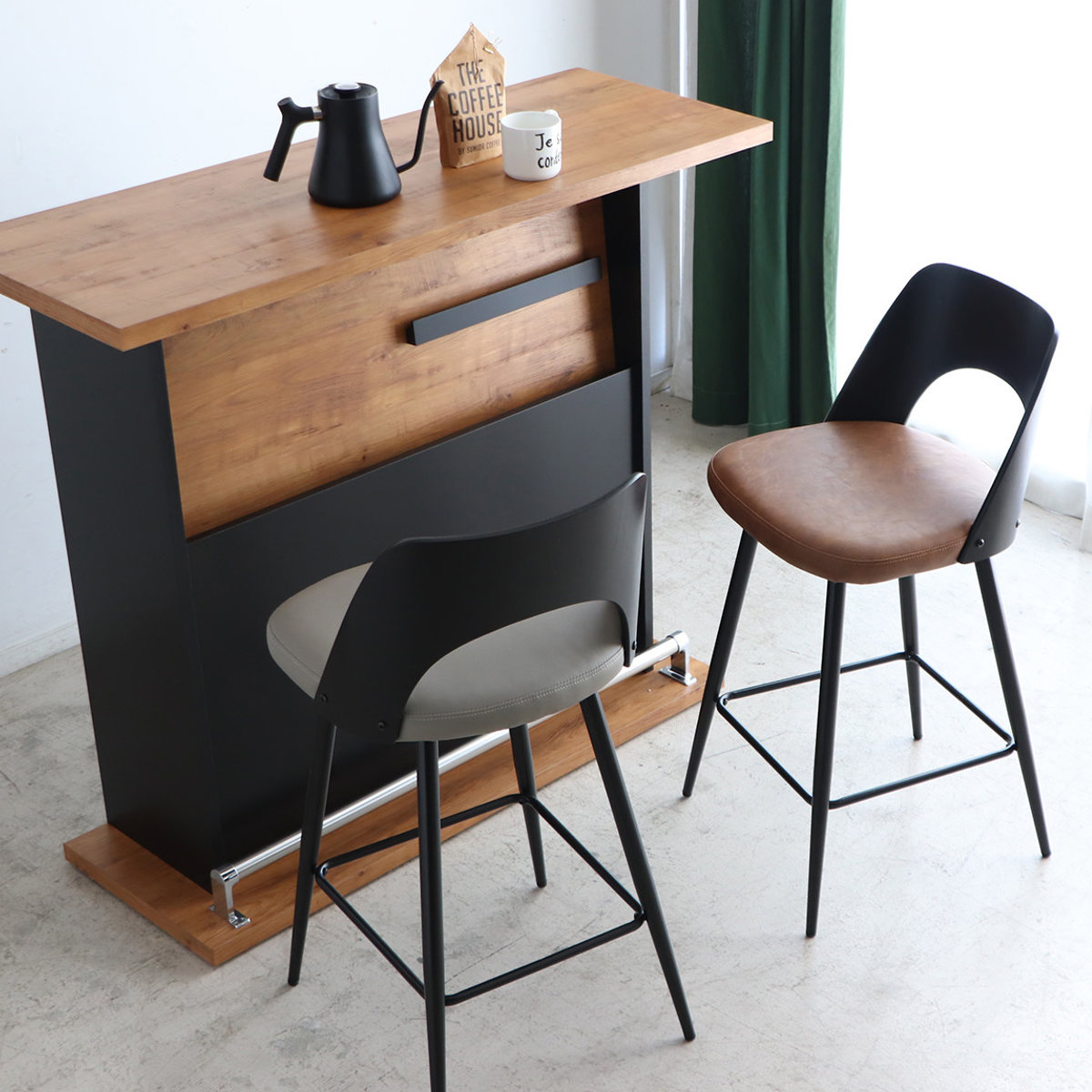 上品でなめらかなフォルムが美しいバーチェアです。木目調の背もたれとPUレザーの異素材を合わせたオシャレなデザインです。チェアとカウンターを合わせると自宅でもバーの空間に変えられ、家族や友達たちと楽しい時間を過ごせます。