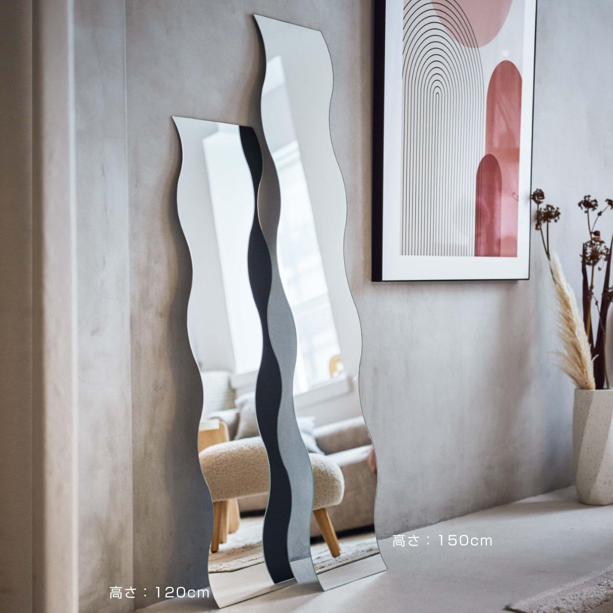 ●波のような個性的なデザインがお部屋を彩るウォールミラーです。
