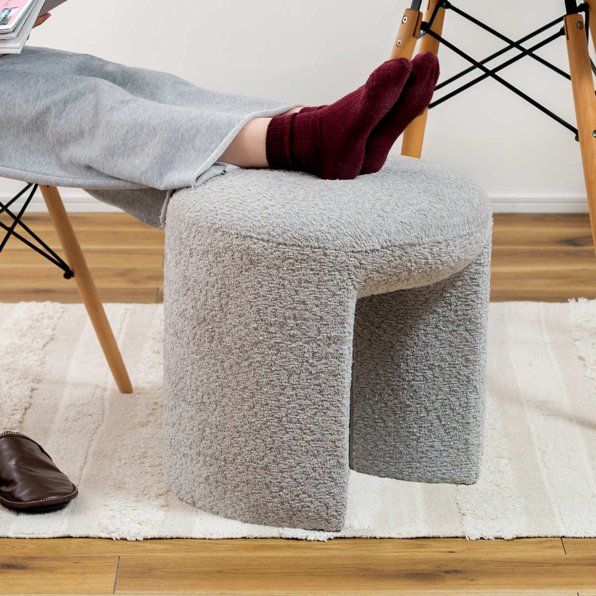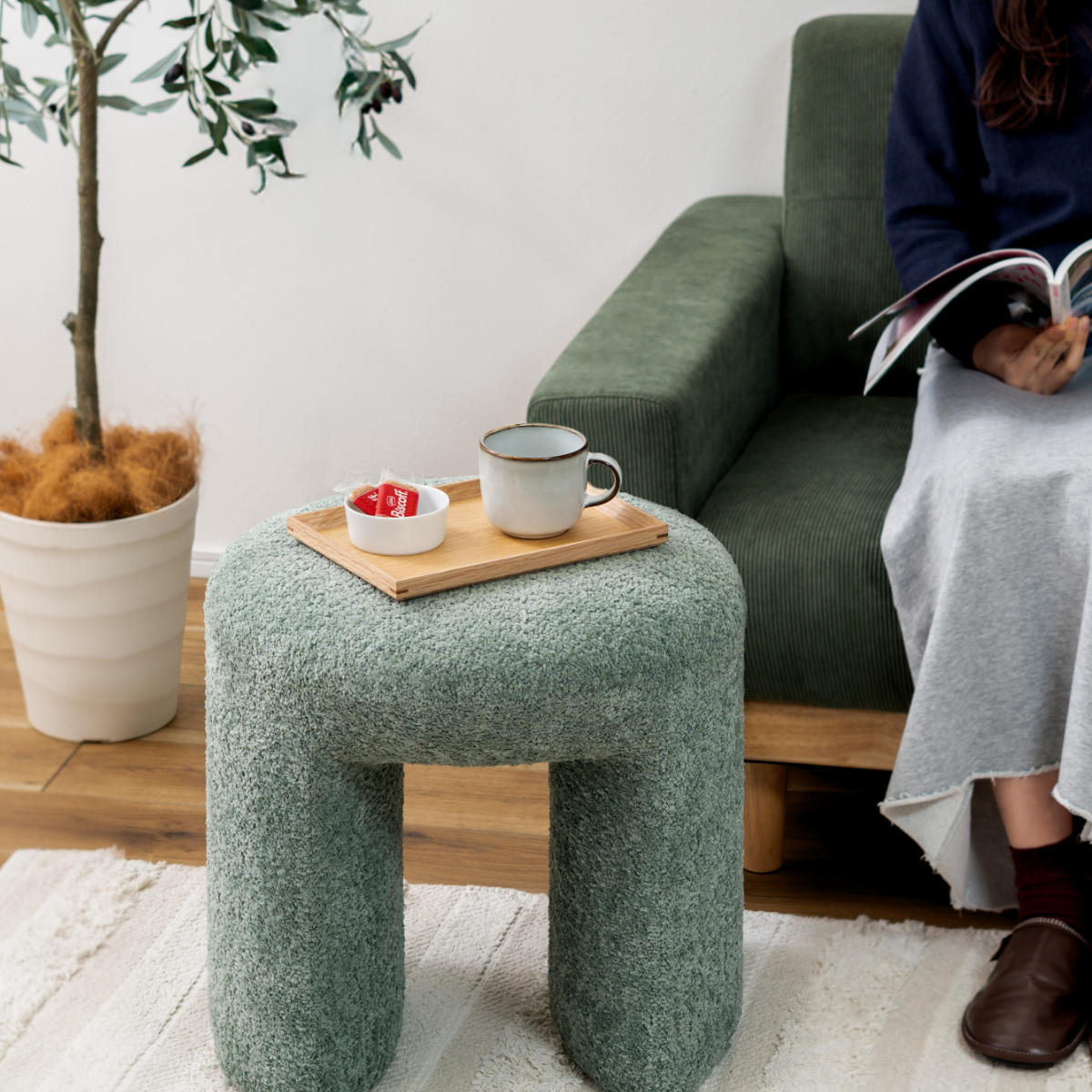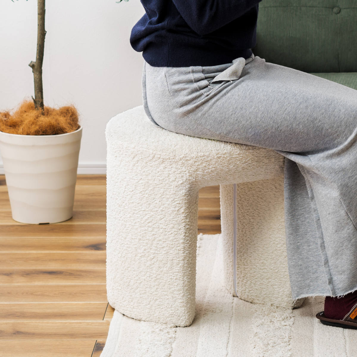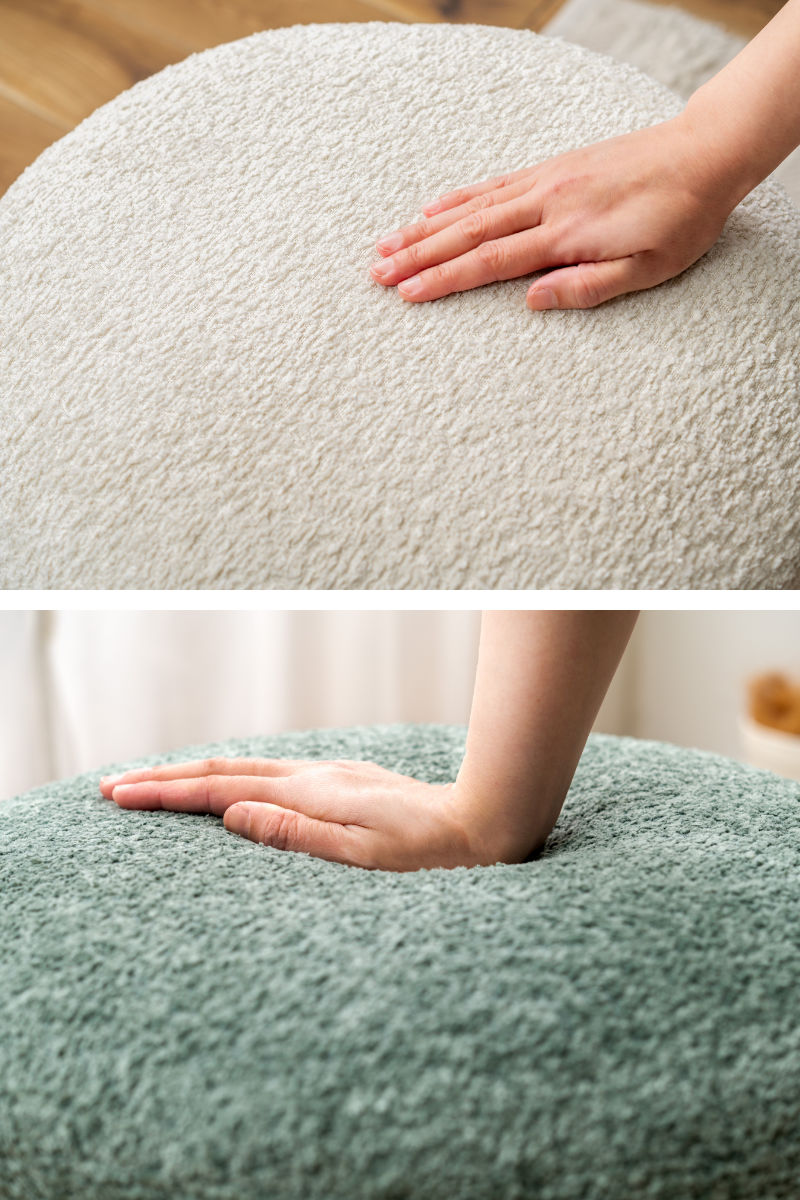 落ち着きのある優しい色合いのブークレ生地を使用しています。ふんわりもこもことした心地い良い質感と柔らかな肌触りが特徴的で、しっかりとした座り心地です。