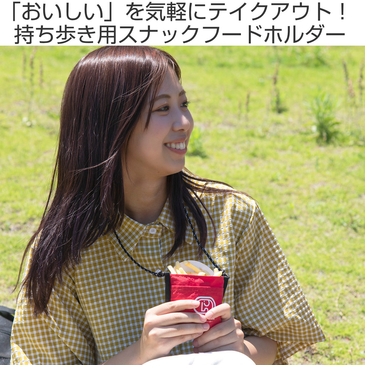 ネックストラップ付きで、テイクアウトしたポテトやドリンク類を首からかけて手ぶらで持ち歩けます。