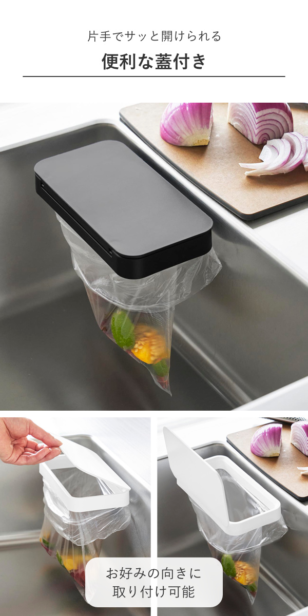 蓋は片手で簡単に開閉でき、お好みの向きに取り付け可能です。使用時以外、蓋を閉めることで中身が直接見えずにおいも防ぐので衛生的です。