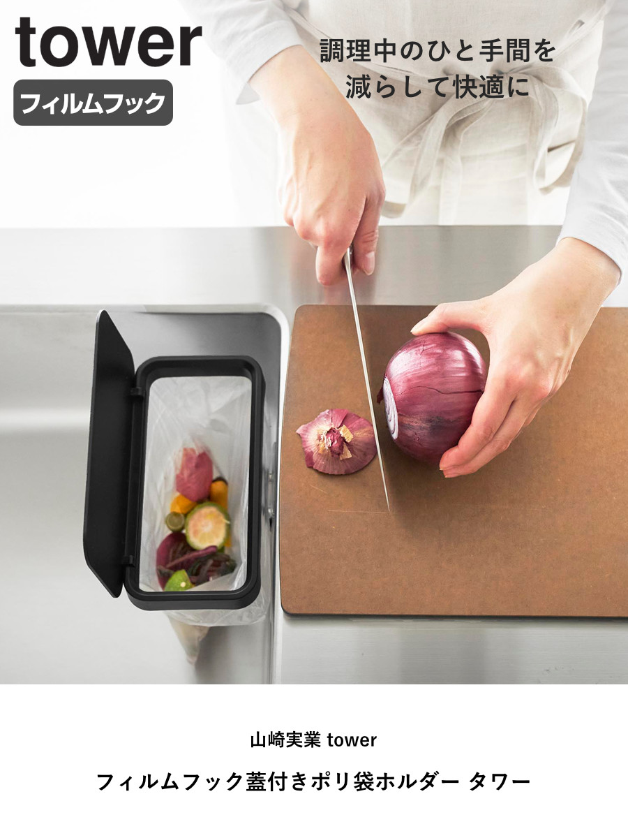 フィルムフックで取り付けできるポリ袋ホルダーです。調理スペース横のシンクに取り付ければ、まな板から野菜くずをスライドさせてそのまま捨てられます。