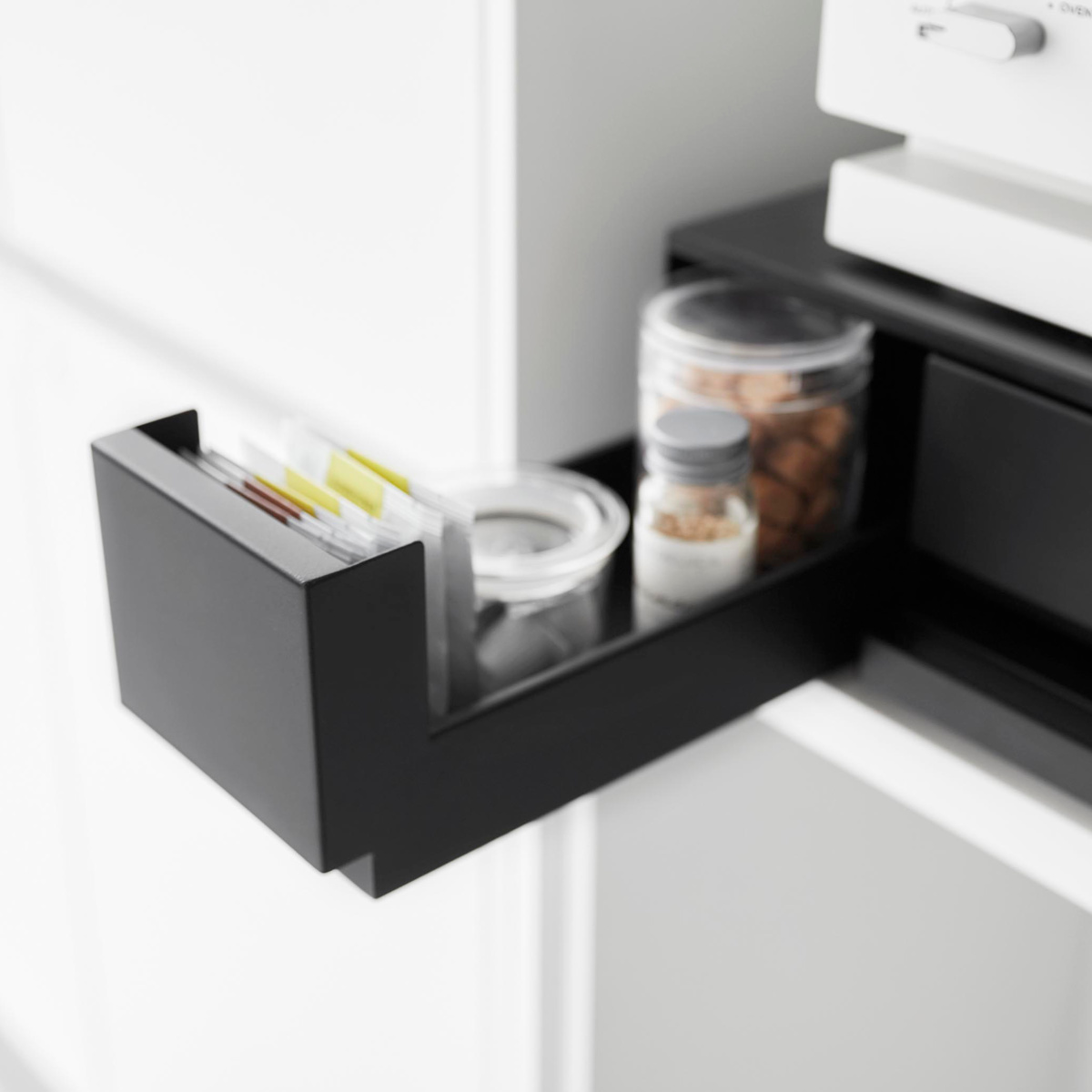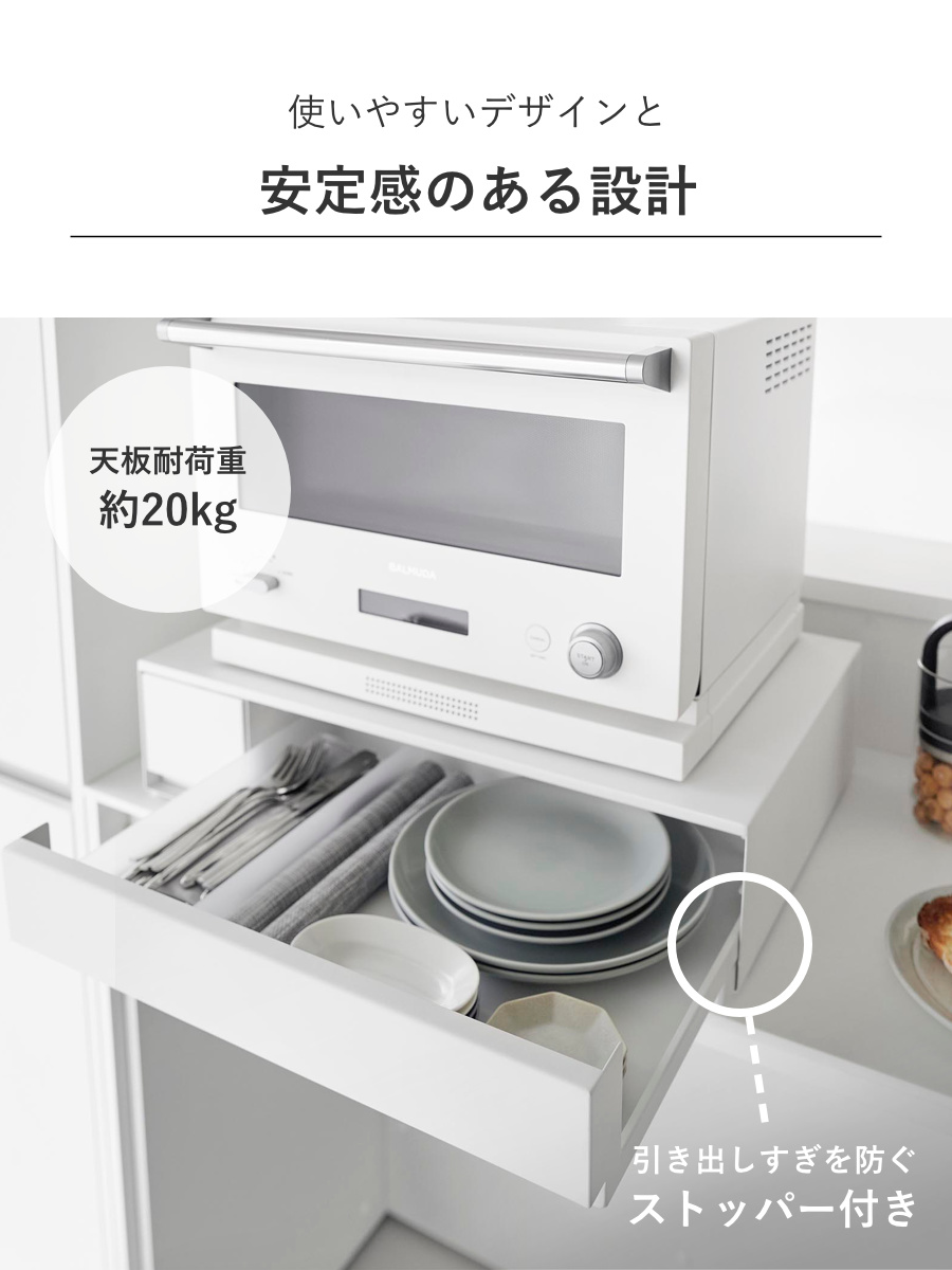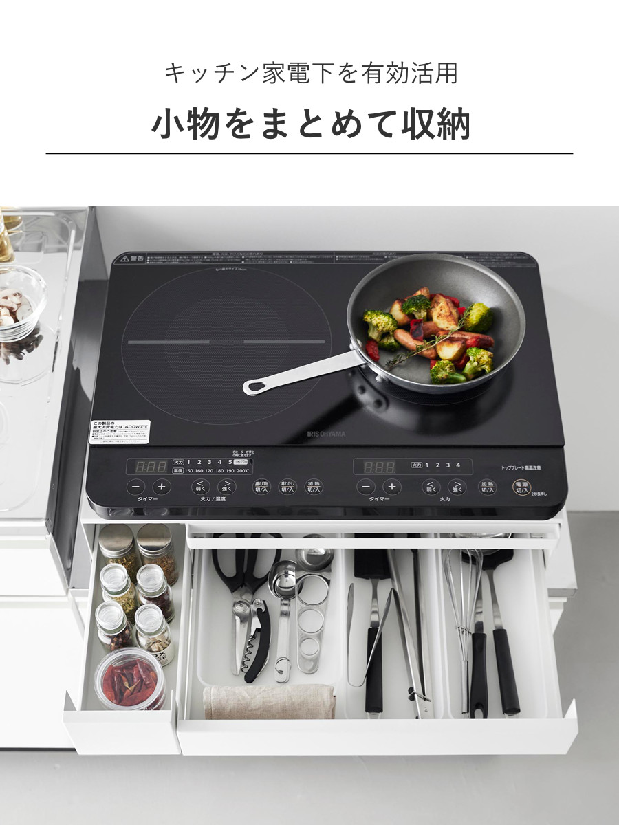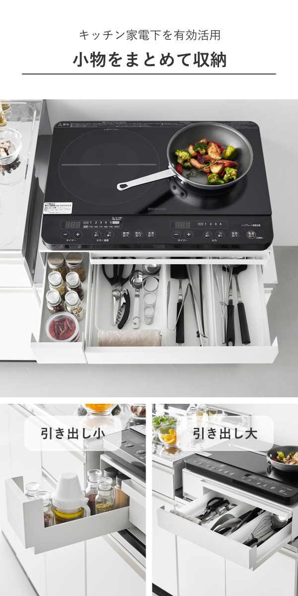 大きい引き出しは調理小物を、小さい引き出しには調味料などを入れて、キッチン小物を省スペースに収納できます。IHクッキングヒーターなどのキッチン家電のすぐ下に設置すれば、ラップをかけたり調理器具を取り出したりの動線がスムーズに行えます。