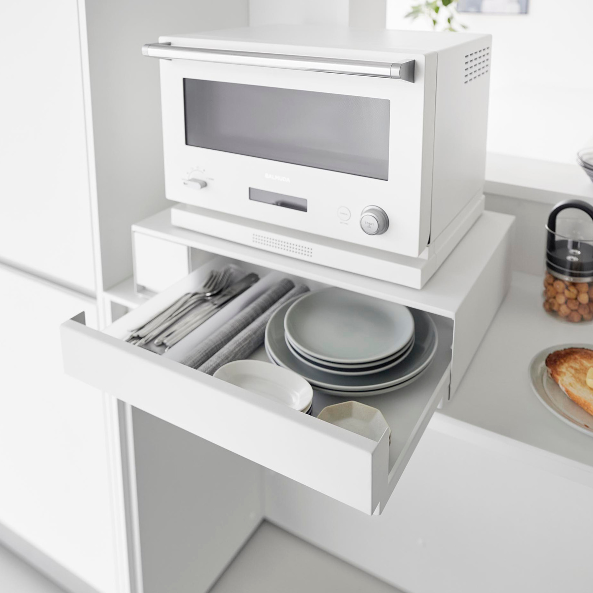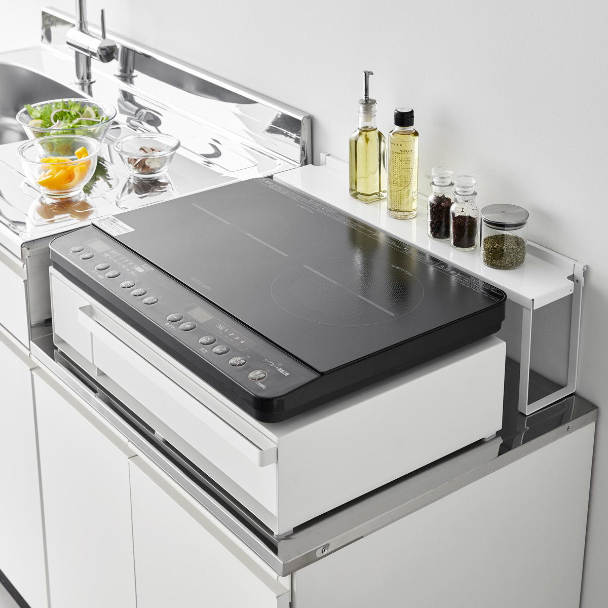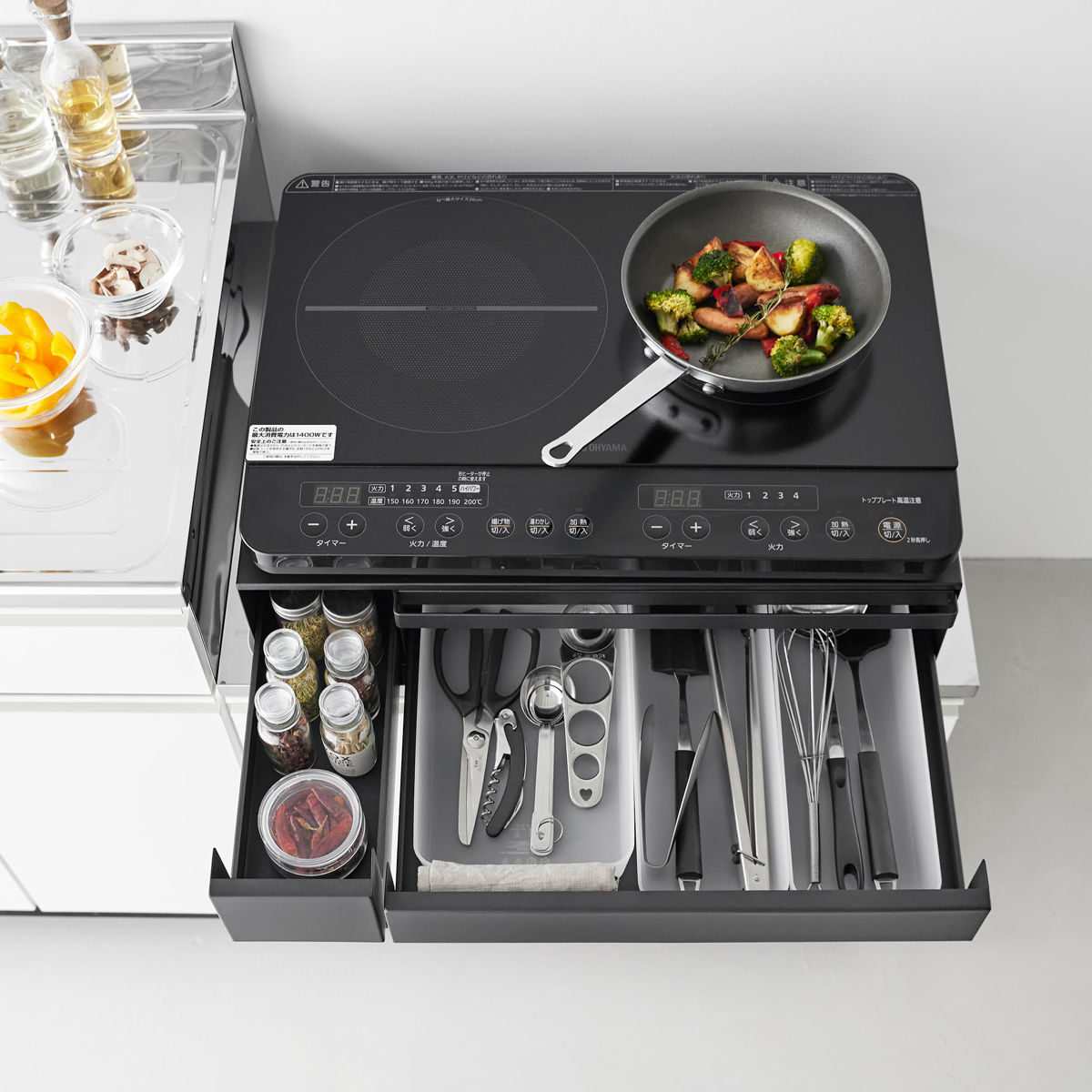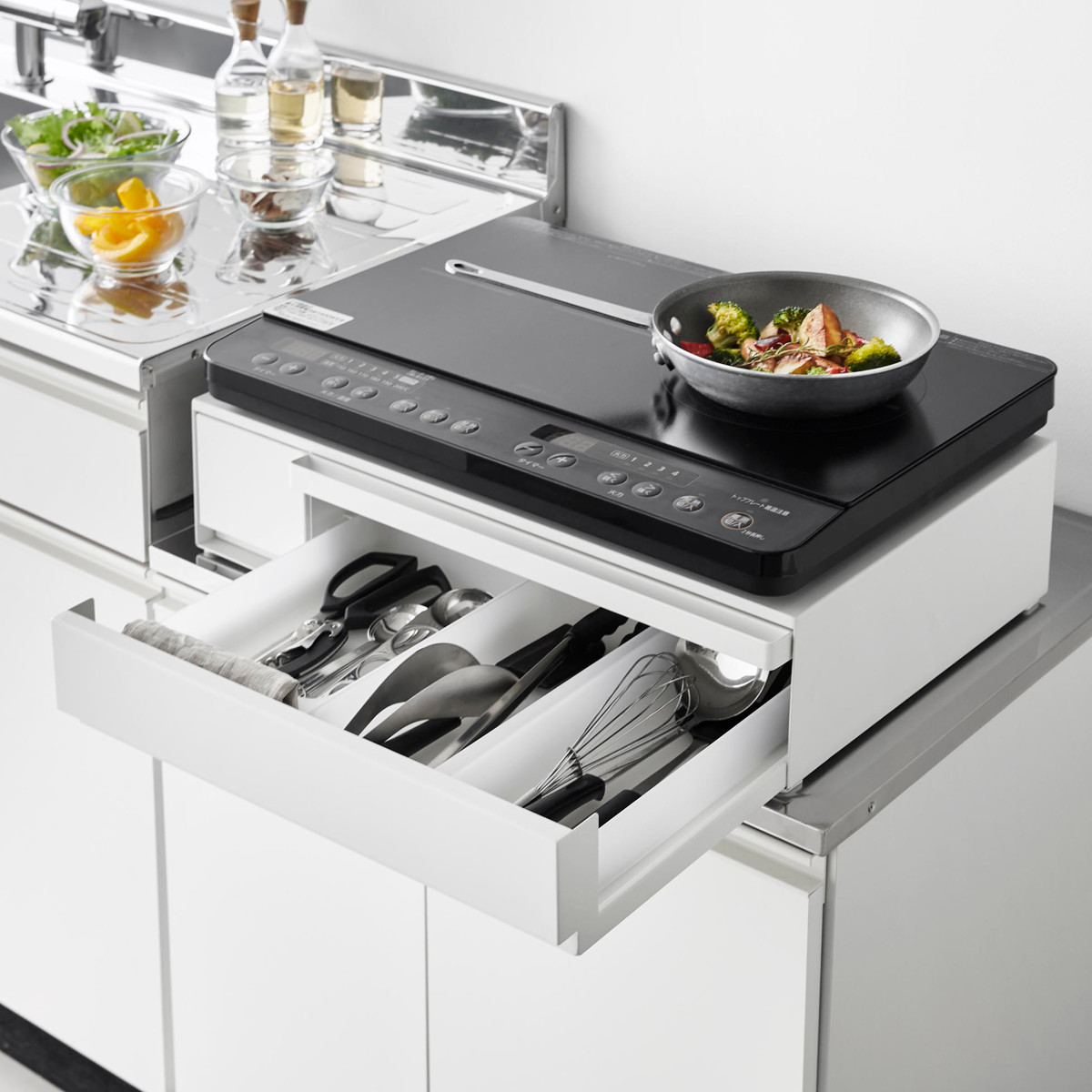 大きい引き出しは調理小物を、小さい引き出しには調味料などを入れて、キッチン小物を省スペースに収納できます。IHクッキングヒーターなどのキッチン家電のすぐ下に設置すれば、ラップをかけたり調理器具を取り出したりの動線がスムーズに行えます。