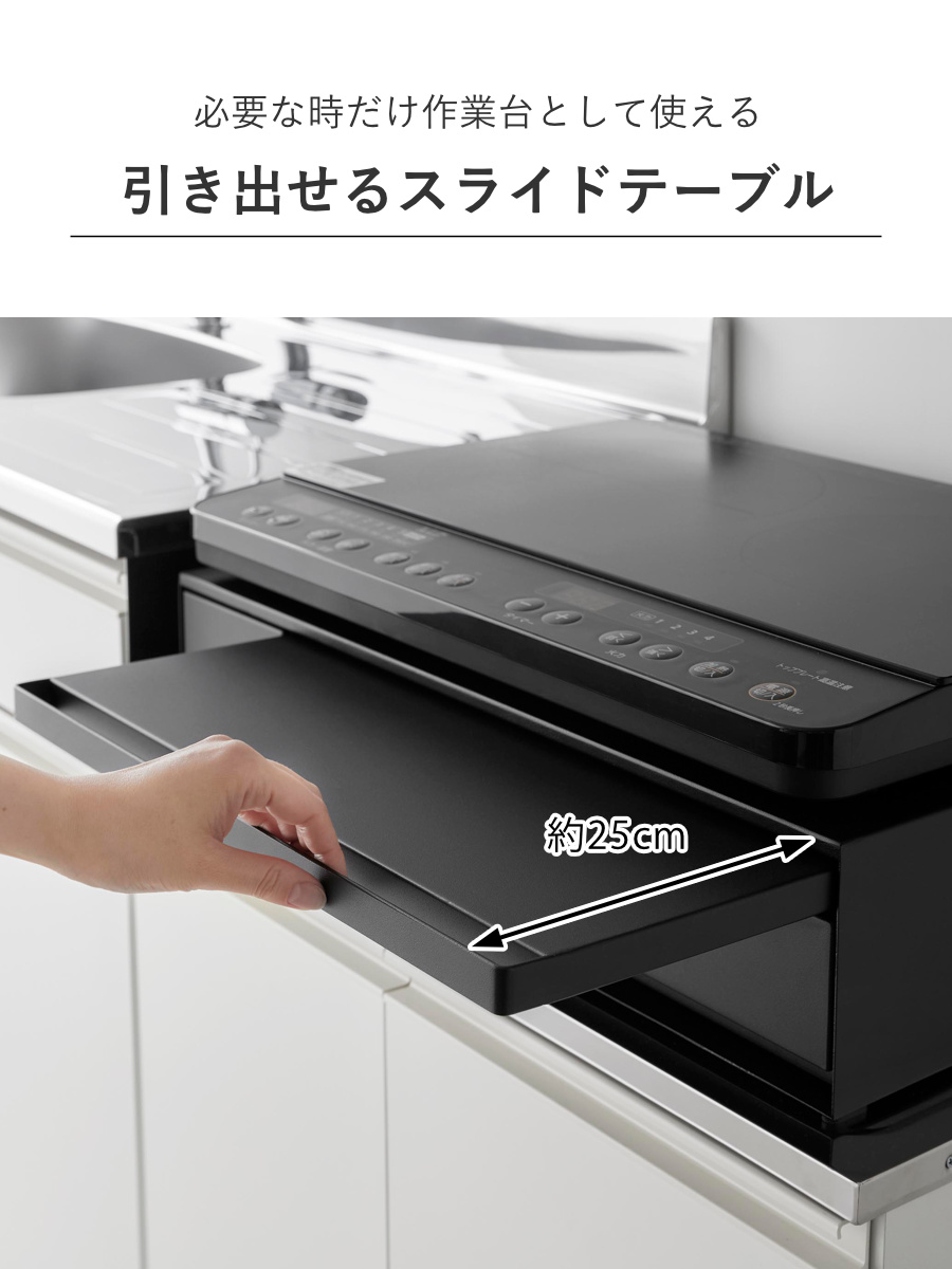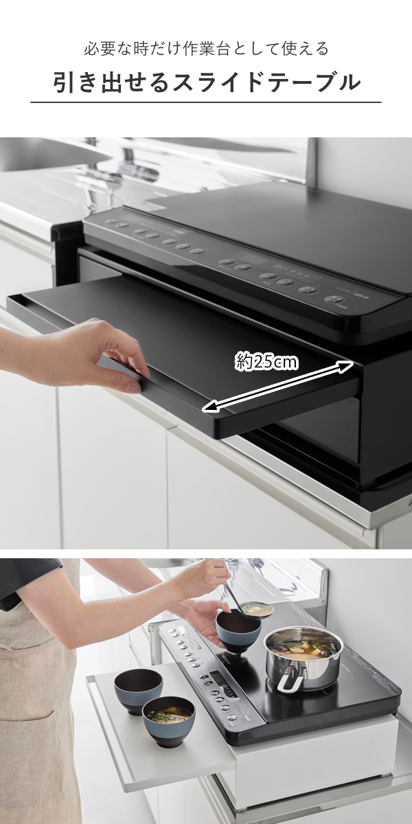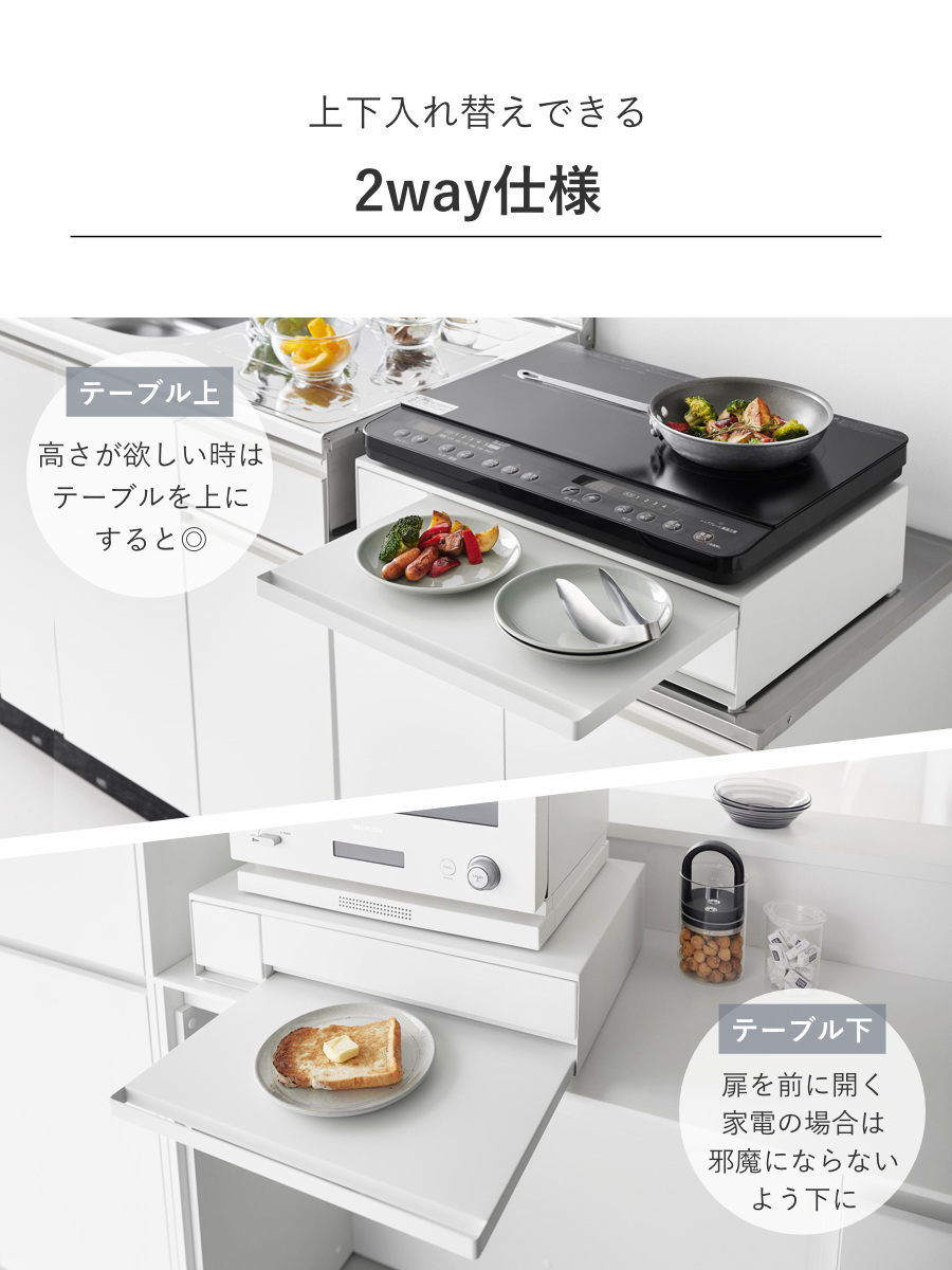 家電下に便利な作業スペースができるスライドテーブル。電子レンジ下に設置すれば温めたものの一時置きに使え、IHクッキングヒーターの下に置けば人数分の料理をよそうのに便利です。幅広く活用できます。