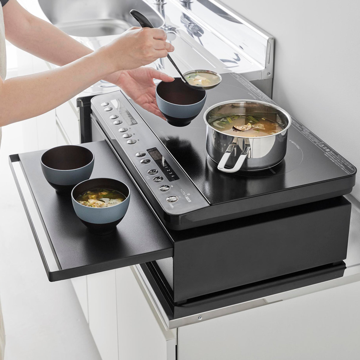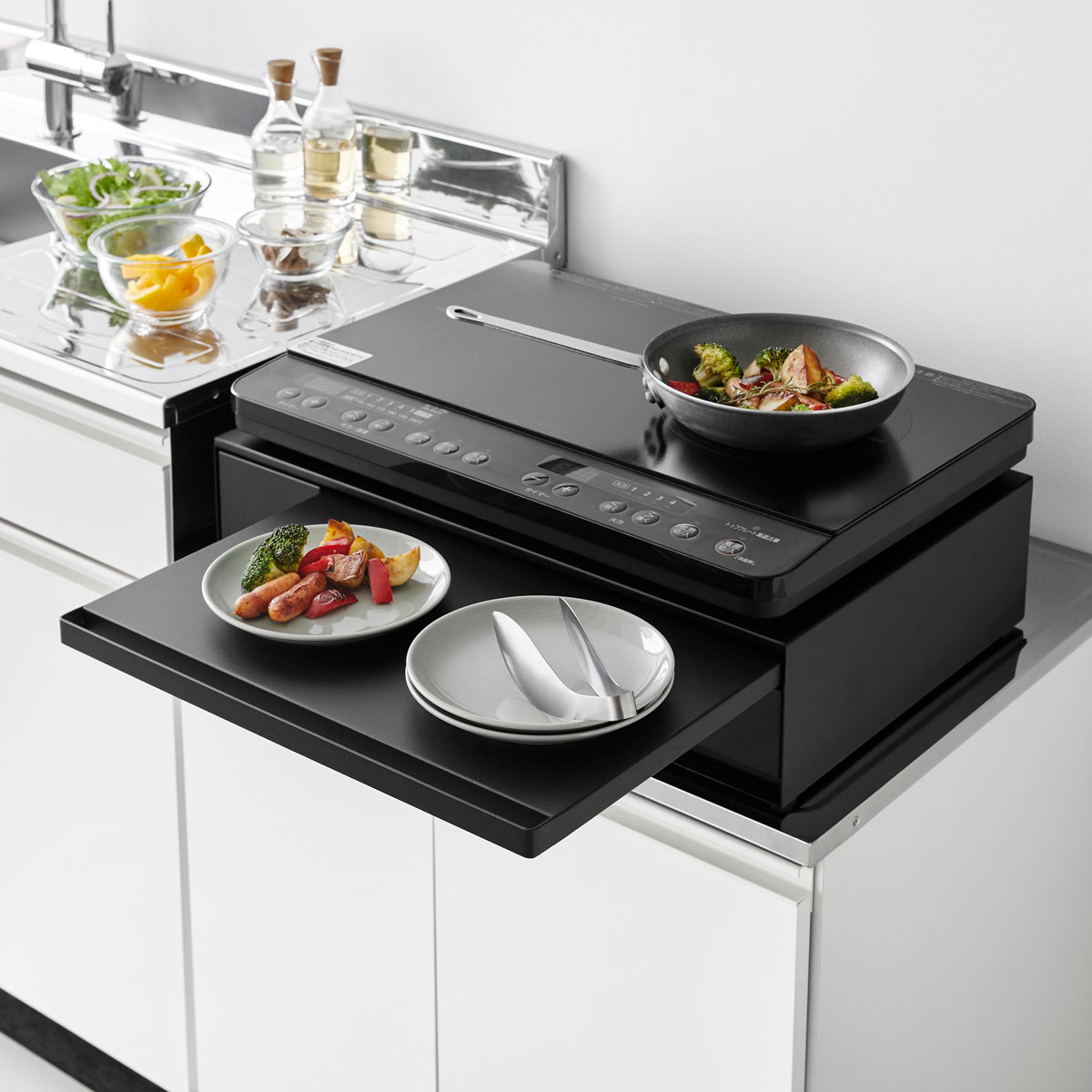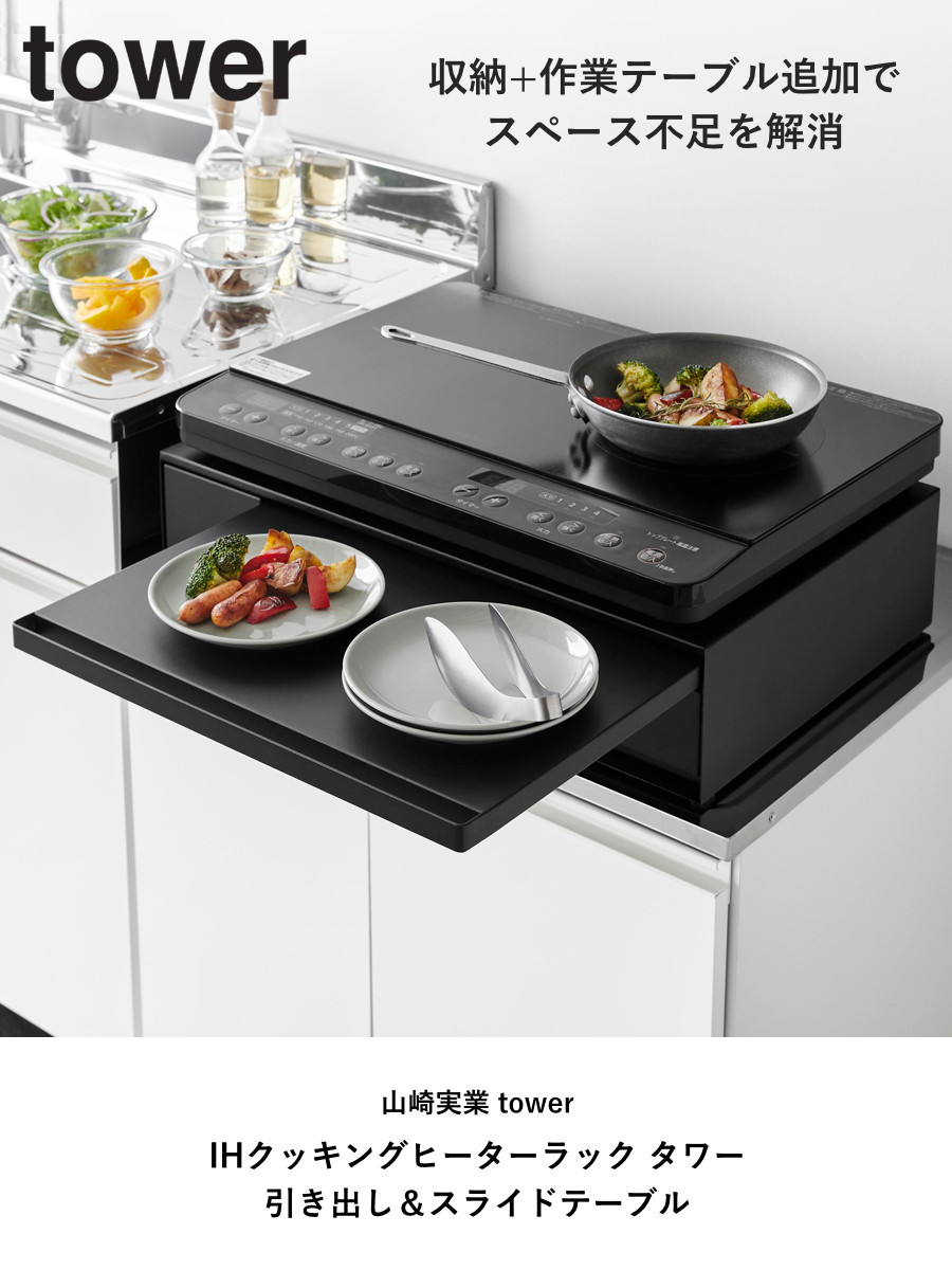 家電下に便利な作業スペースができるスライドテーブル。電子レンジ下に設置すれば温めたものの一時置きに使え、IHクッキングヒーターの下に置けば人数分の料理をよそうのに便利です。幅広く活用できます。