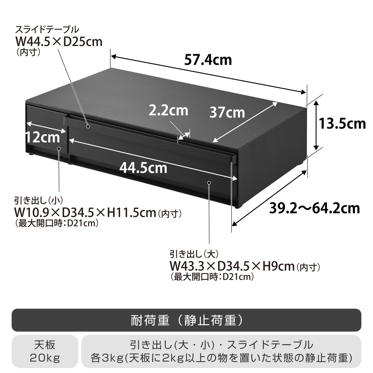 - 幅57.4×奥行39.2~64.2×高さ13.5cm