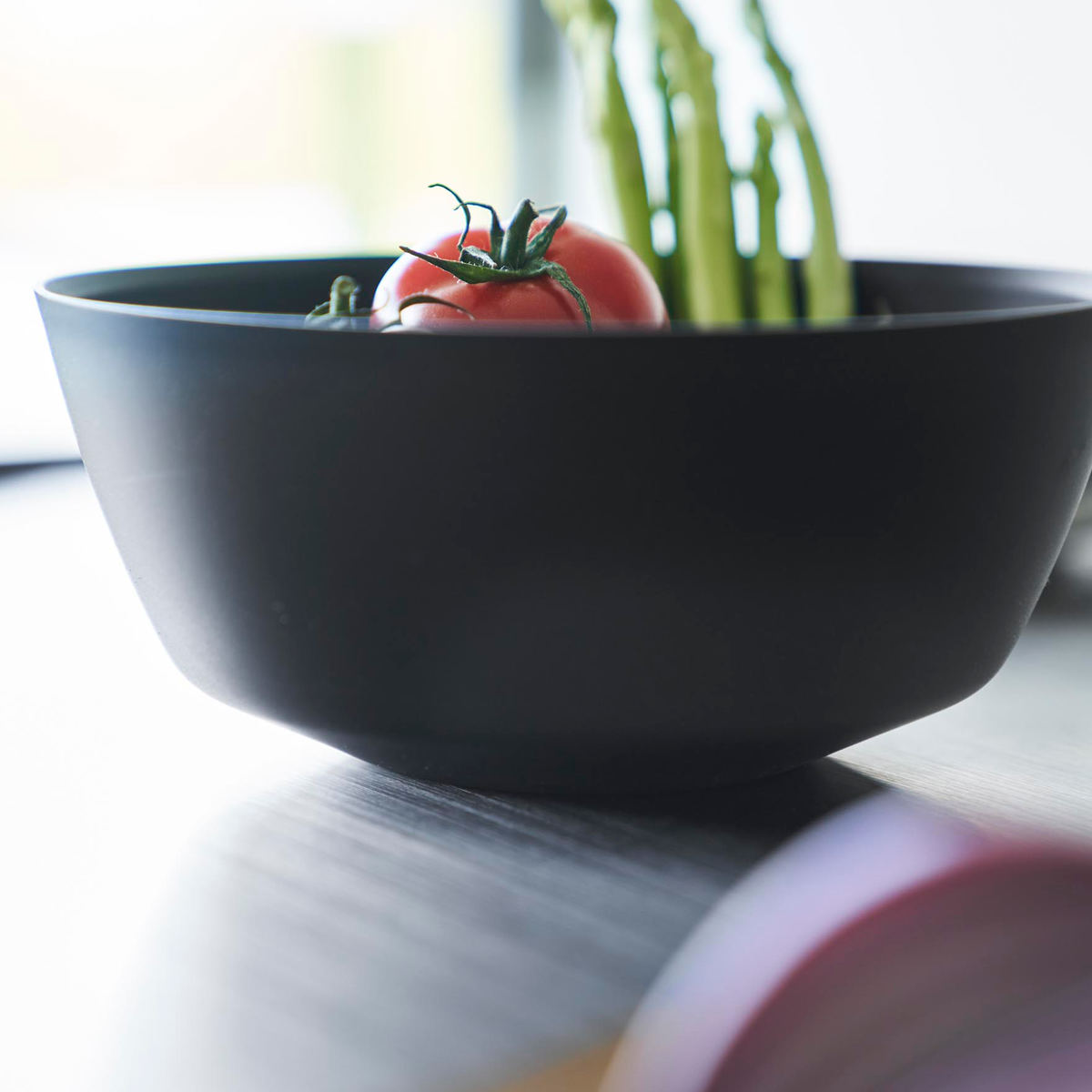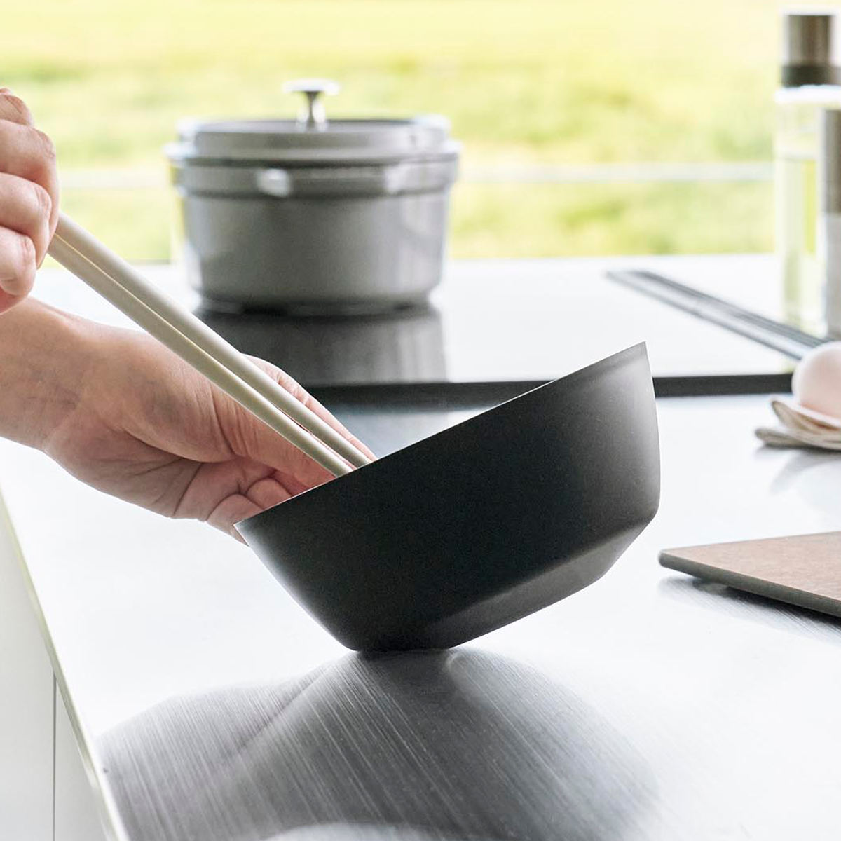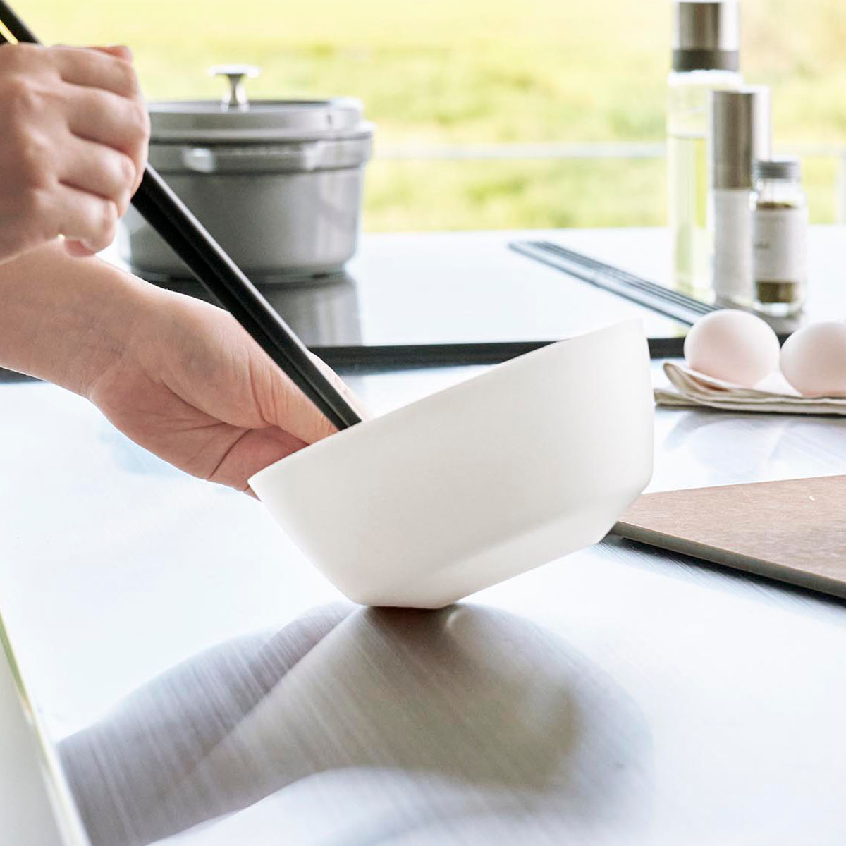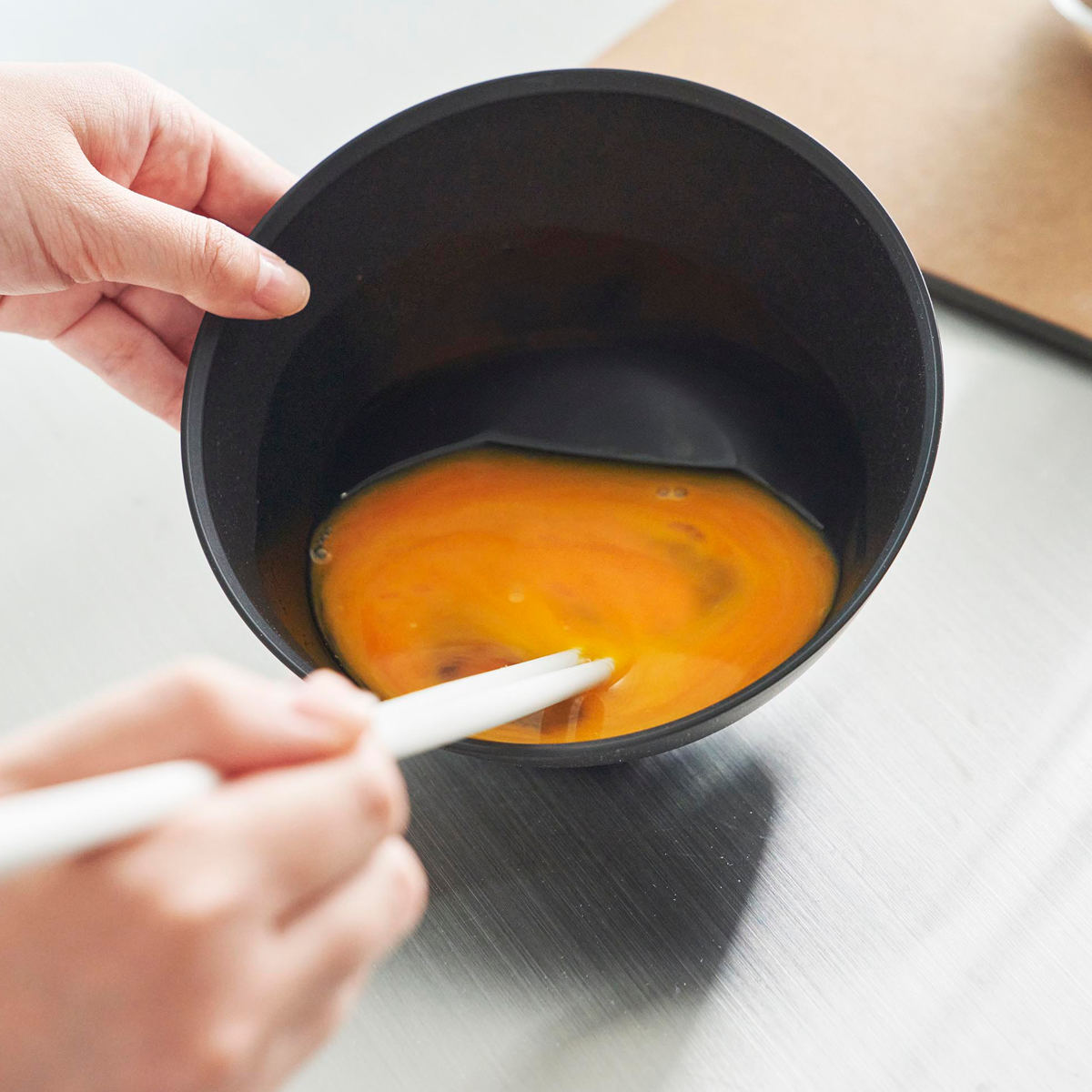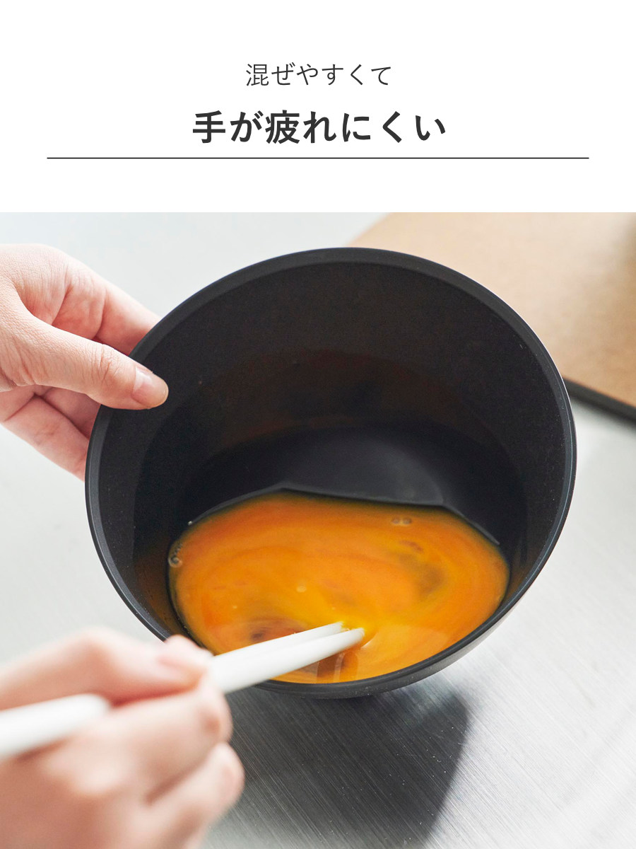 ボウルを倒した時に斜めをキープできる構造で、食材が混ぜやすく手が疲れにくい調理ボウルです。料理の下ごしらえからお菓子作りなど毎日使う調理ボウルだからこそ使いやすさを追求しました。