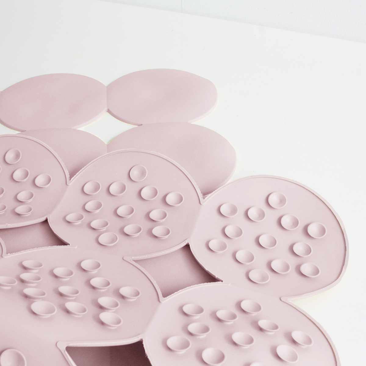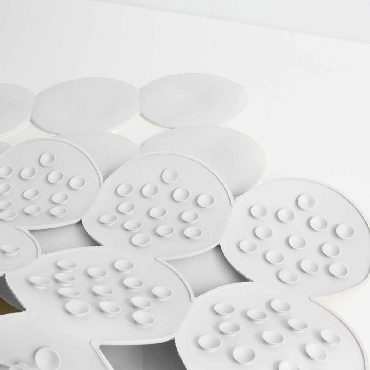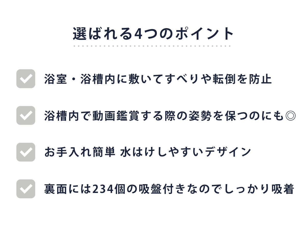 マット裏面は滑り止め付きです。234個の吸盤がしっかりと浴槽に密着し、浴槽への出入りがしやすいです。簡単に設置できてズレにくく、お子様からご高齢の方まで安心してお使いいただけます。