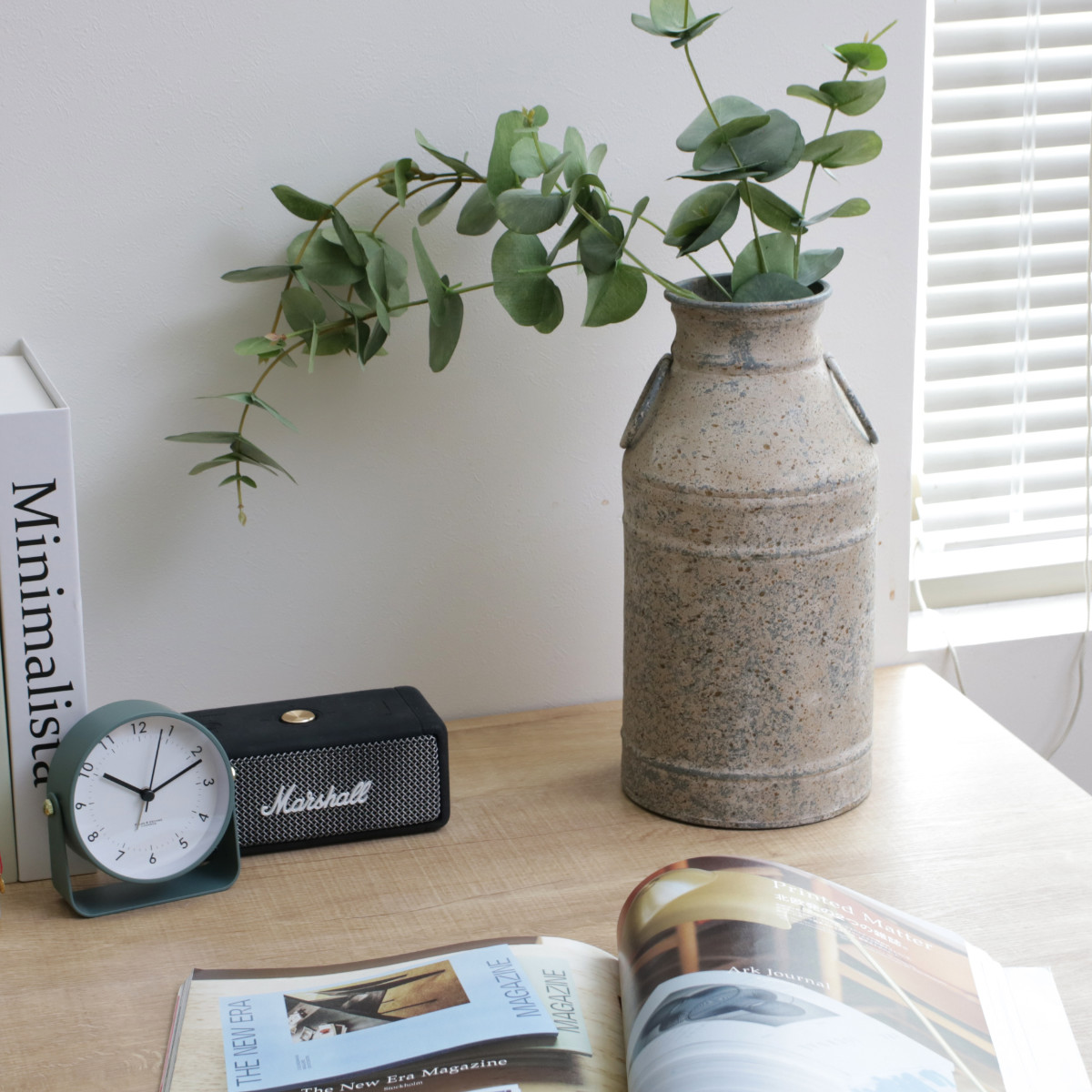 机の上に乗せても丁度良い大きさのミルクカンなので、造花や大き目のスワッグをざっくり入れて飾ると、一気にお部屋がセンスアップします。