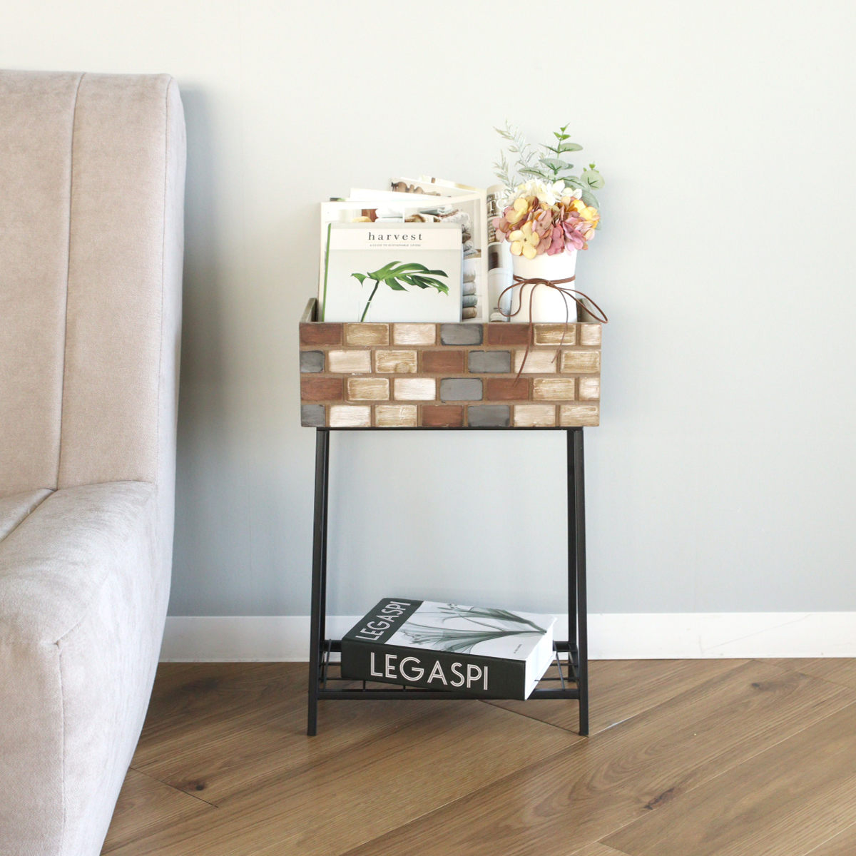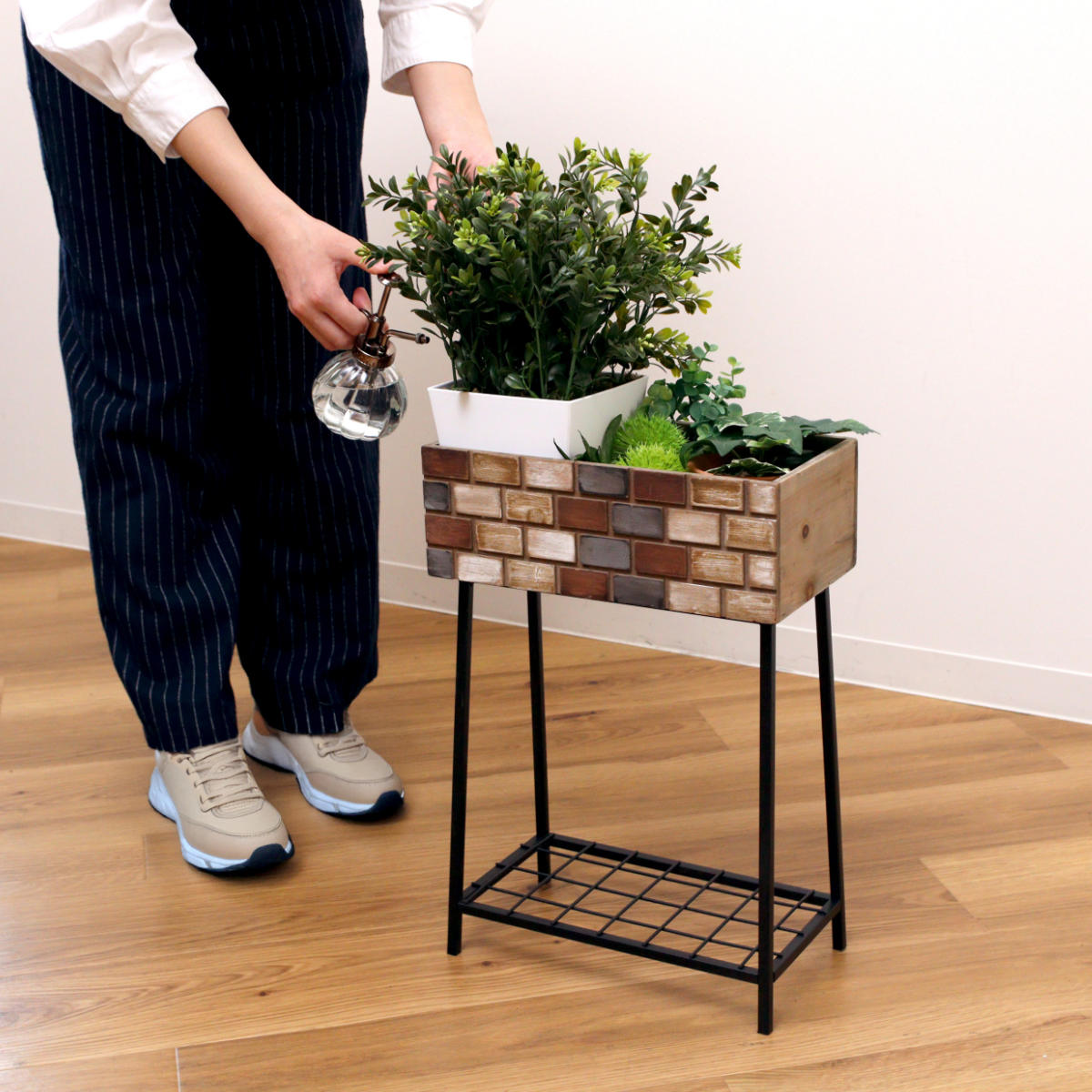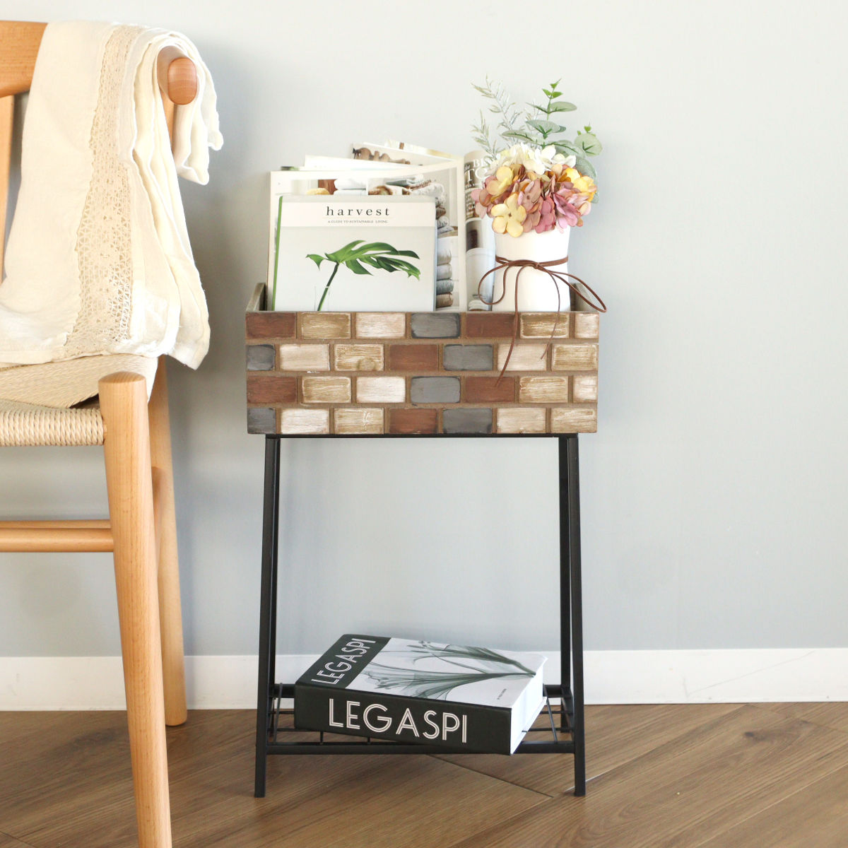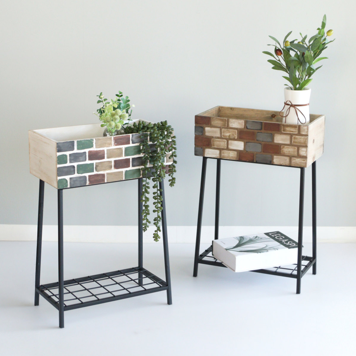 レンガ造りの小さなお家をイメージしたボックススタンドです。ガーデンアイテムとして観葉植物を飾ったり、雑誌や小物なども一緒に置いてオープンシェルフとしてもお使いいただけます。アンティークな風合いと天然木の温かみのある素材感が雰囲気のある空間を演出します。