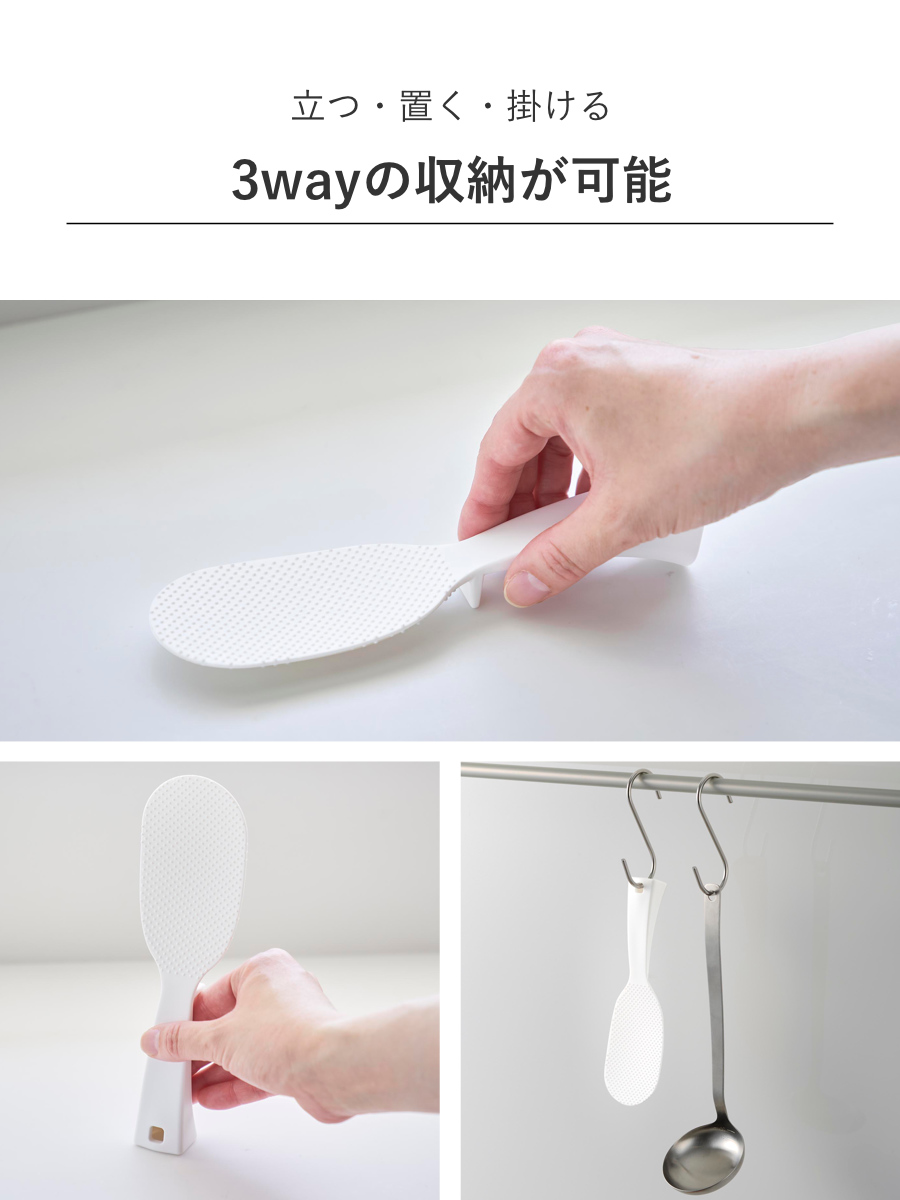 立てて置く・寝かせて置く・掛けて収納ができるしゃもじです。立たせられるのはもちろん、寝かせて置く時もすくう面がテーブルに付かない構造なので衛生的です。また、フックをかける穴がついているので吊るすこともできます。