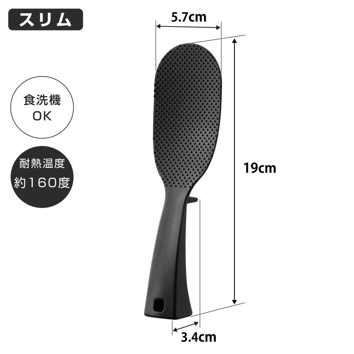 幅の狭いお弁当箱にもご飯が入れやすいスリムサイズです。お米が切りやすく、釜の底のお米もすくいやすいヘラ形状で、すくう面はお米がつきにくいエンボス加工です。