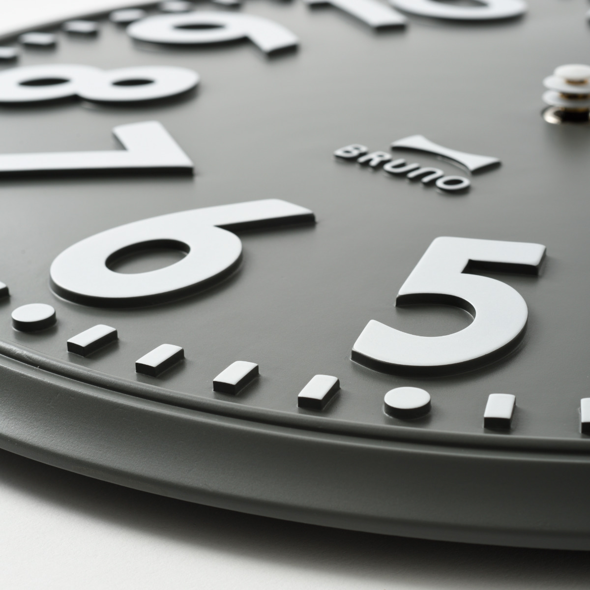 立体的なエンボス文字盤が施された壁掛け時計です。前面カバーが無いため光が反射せず、どの時間帯・どの角度からでも「見やすい」をかなえます。