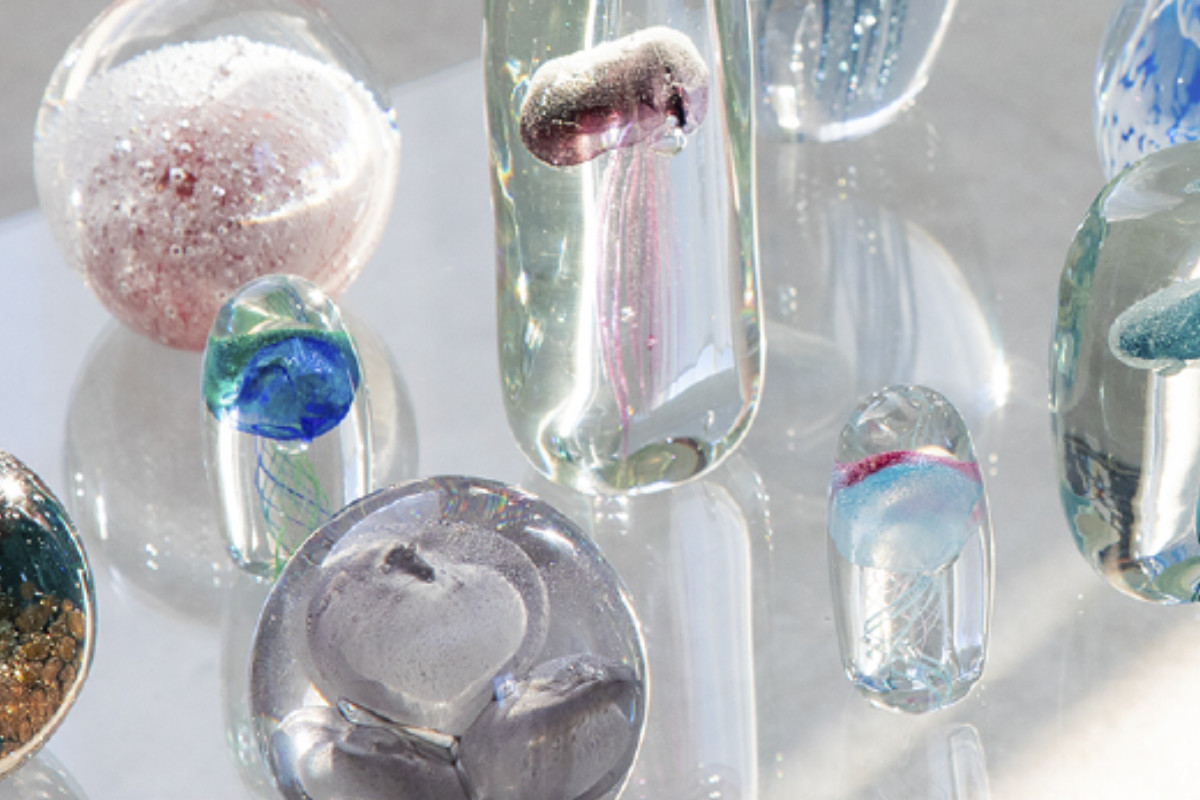 クラゲが浮遊している様なデザインのガラスオブジェです。光の反射によって様々な表情が楽しめます。毎日違った一面を見ることができるかもしれません。