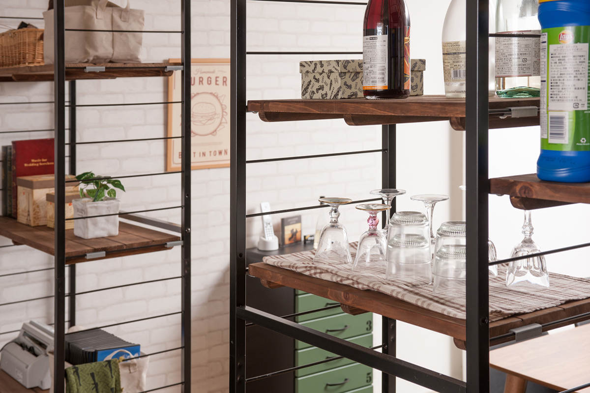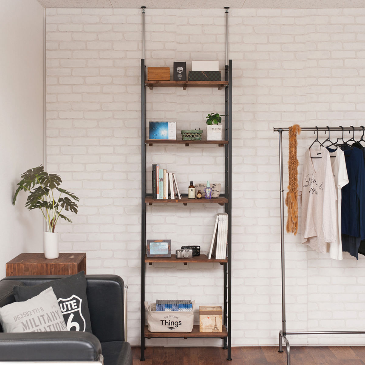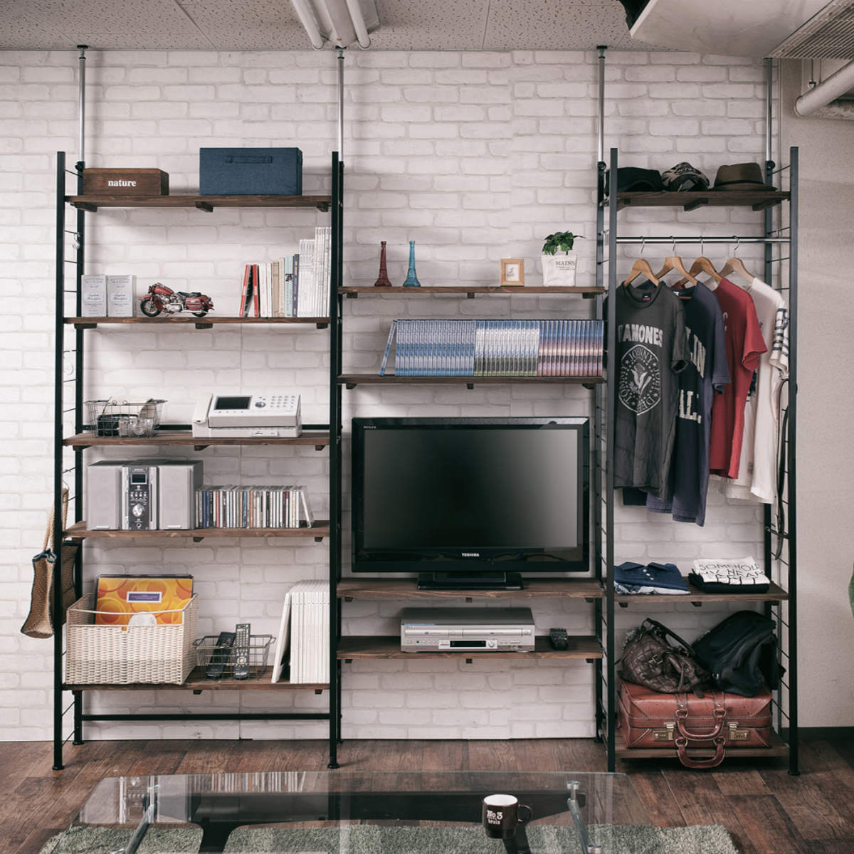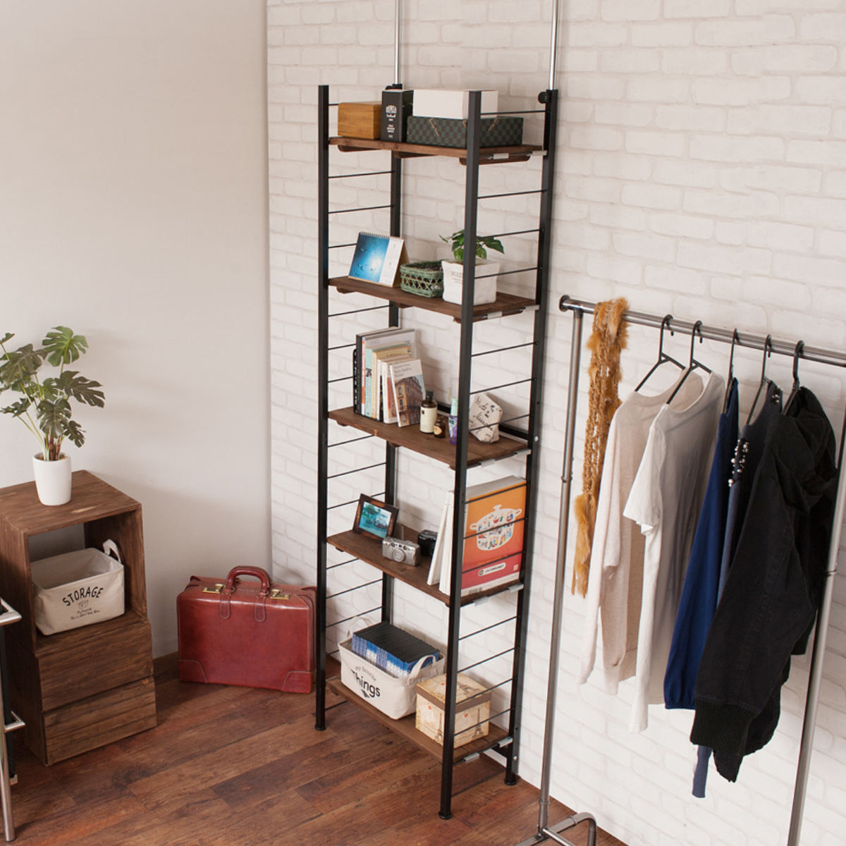 雰囲気のある古木を使って作られたような壁面収納「オープンラックタイプ」です。工事不要で簡単に設置できる突っ張り式なので、賃貸のお部屋にお住まいの方にもおすすめです。マットなブラックスチールと天然杉の棚板がヴィンテージ感漂う空間を作り出します。