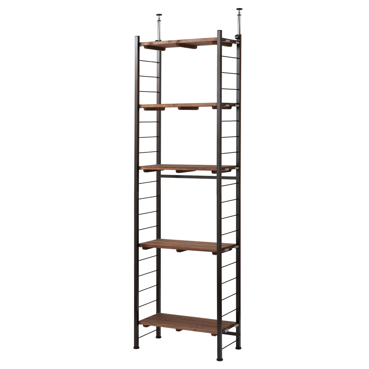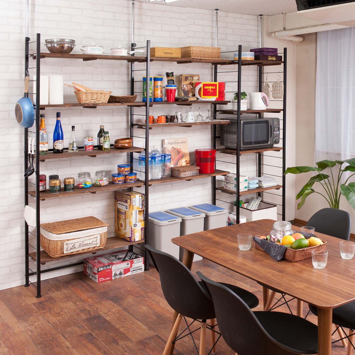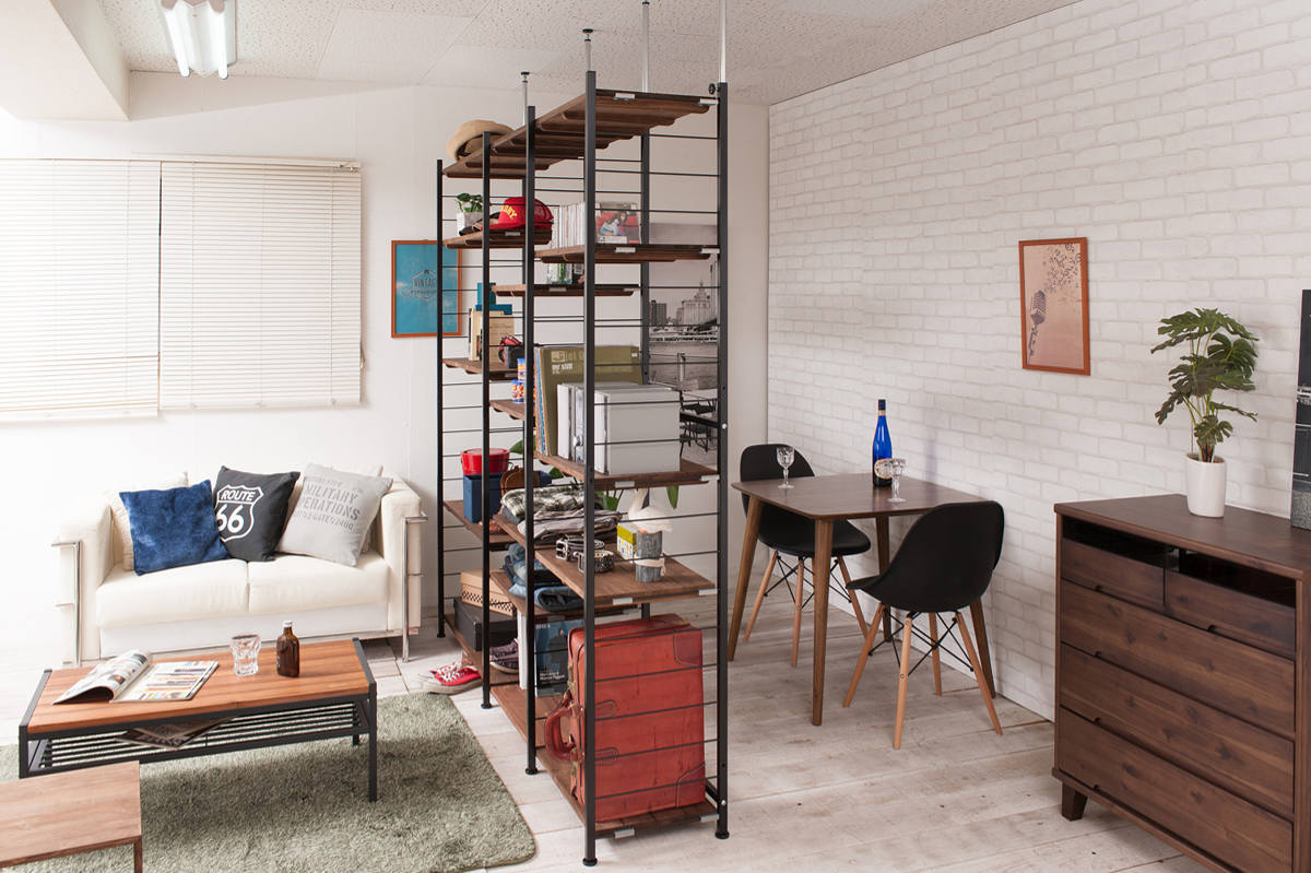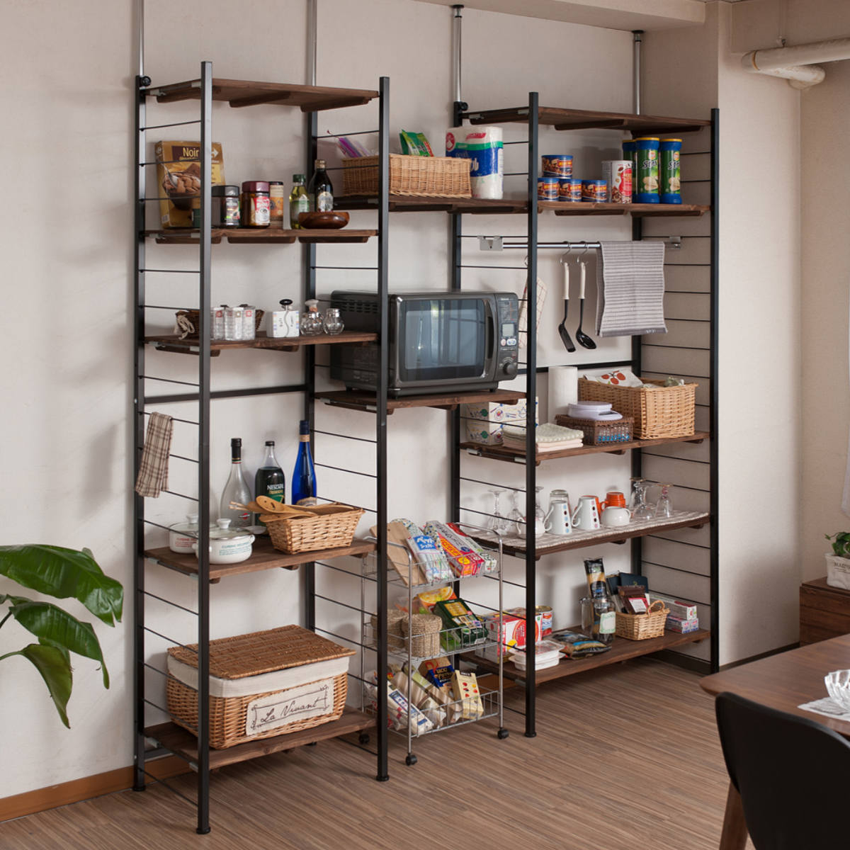 雰囲気のある古木を使って作られたような壁面収納「オープンラックタイプ」です。工事不要で簡単に設置できる突っ張り式なので、賃貸のお部屋にお住まいの方にもおすすめです。マットなブラックスチールと天然杉の棚板がヴィンテージ感漂う空間を作り出します。