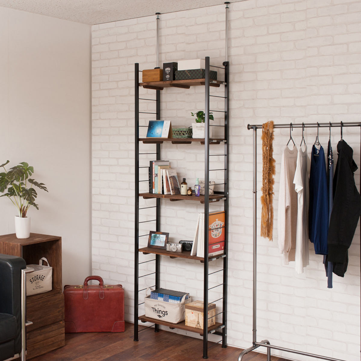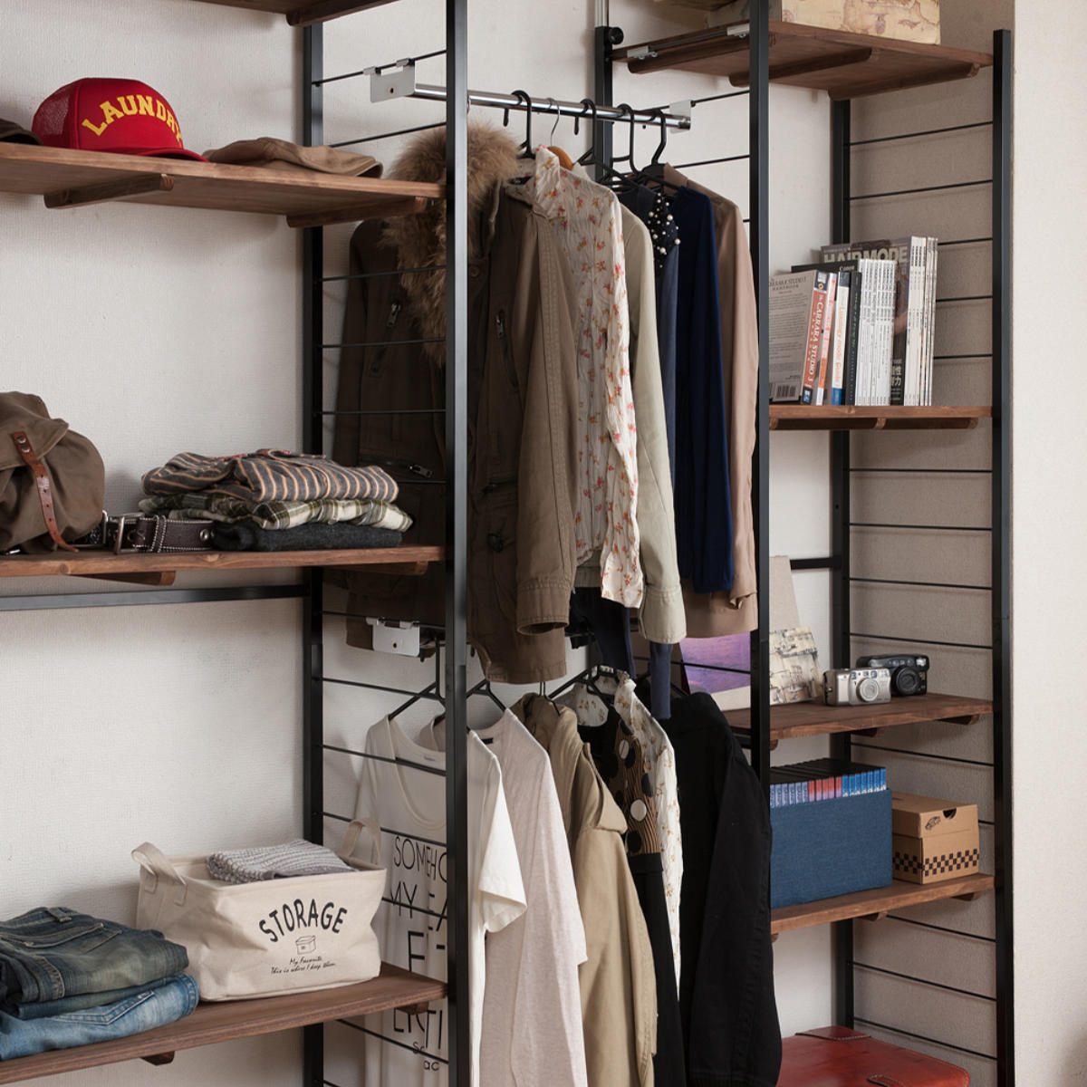 天然木を棚板に使用したヴィンテージな風合いの突っ張り壁面収納