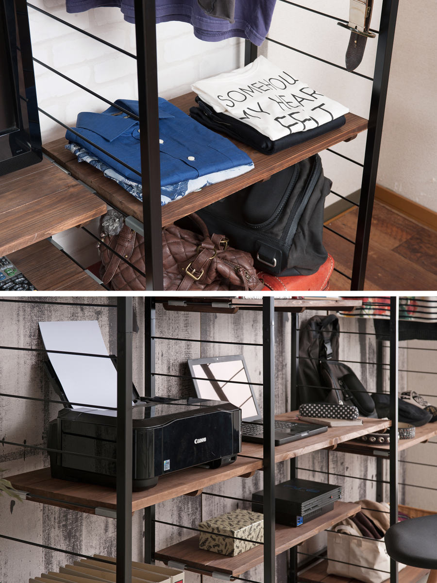 飾り棚のように収納できるオープンラックタイプです。耐荷重10kgの頑丈な棚板で、プリンターなどの電化製品も安心して置くことができます。棚板は10cmピッチ20段階で高さの調節が可能です。