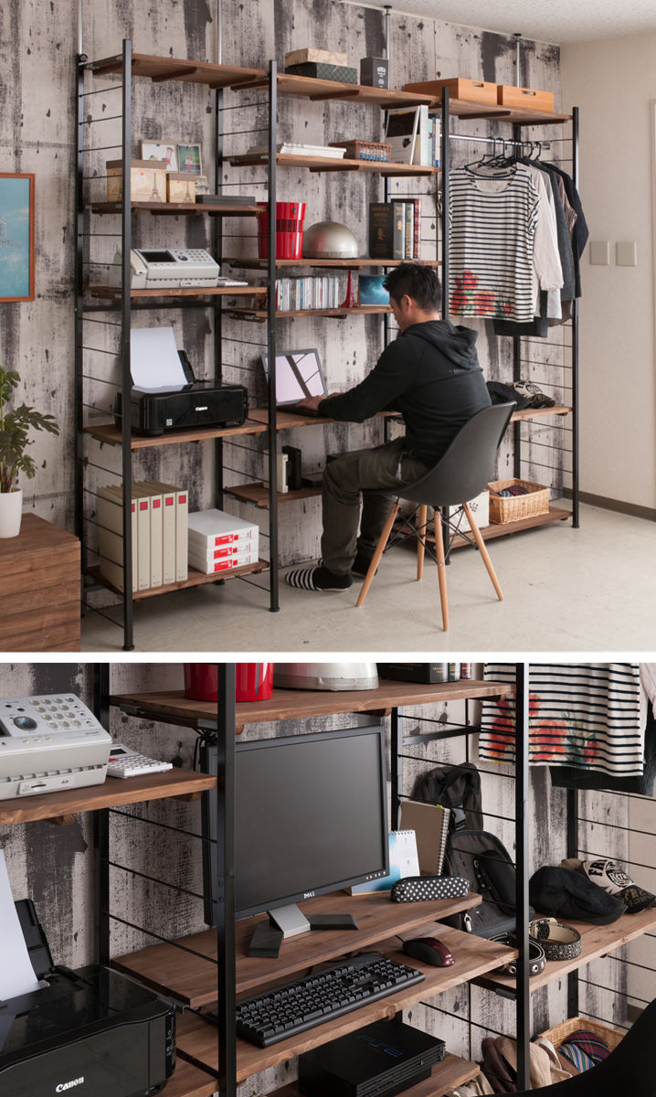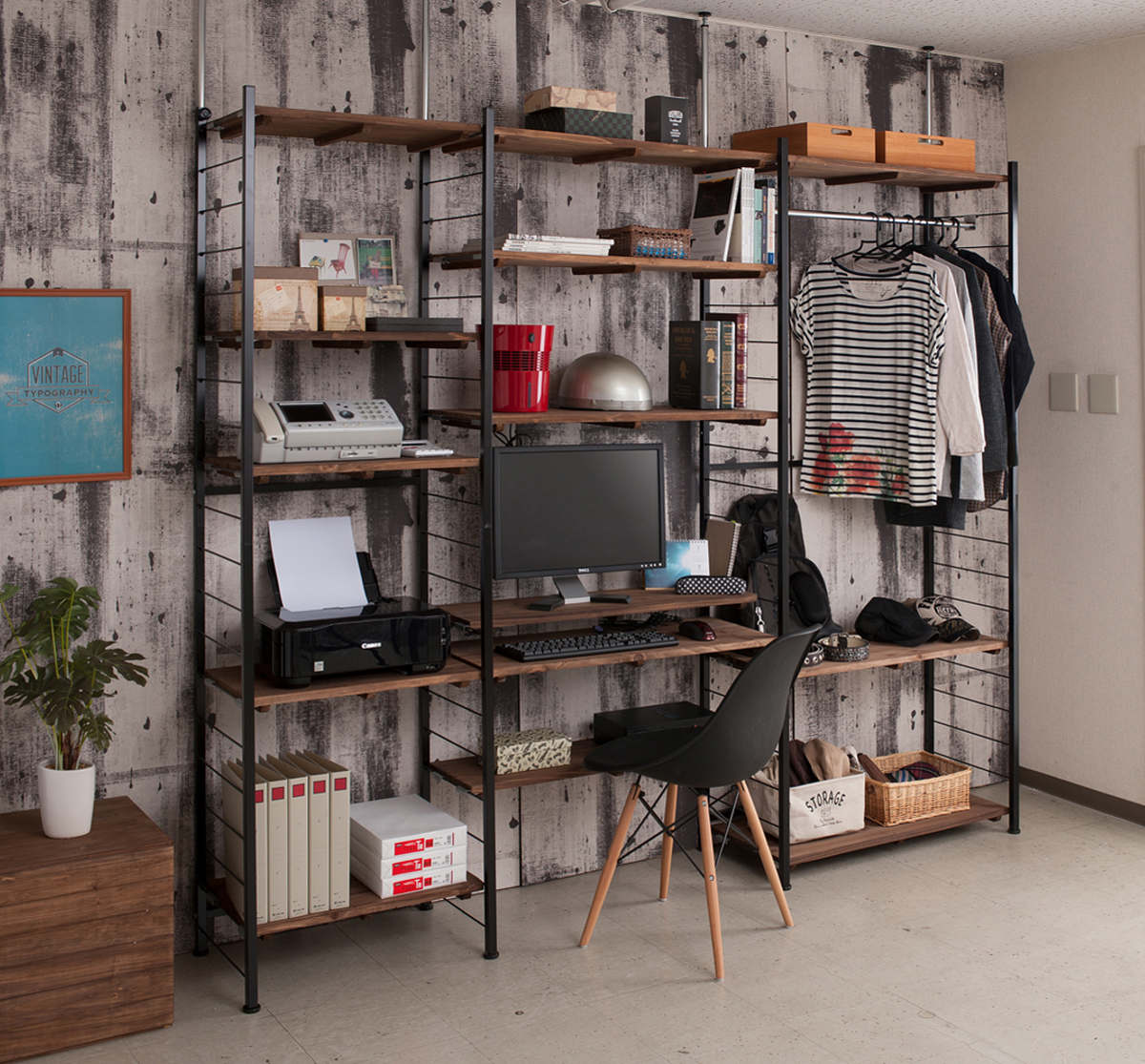 棚板を利用して、作業台やデスクとして使うのもおすすめです。ラックとデスクが一体化したオリジナルの家具で、空間の限られたお部屋でもワークスペースを確保できます。