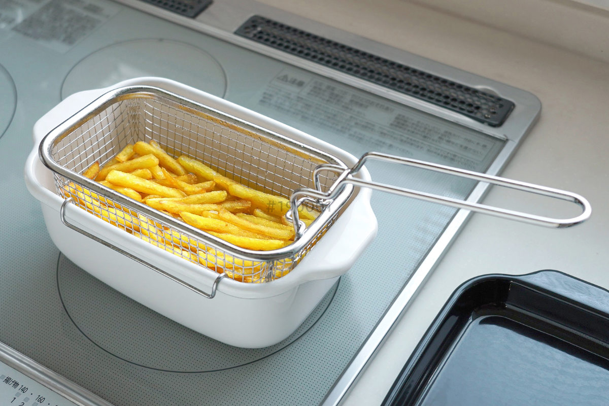 大人気「角型天ぷら鍋」のセットに、フライヤーバスケットが追加されました。1個ずつ菜箸で掴むのが面倒なポテトや唐揚げなど一気に取り出すことができてとっても便利です。側面フックを鍋の縁に引っ掛ければ、手を離した状態で油切りができます。