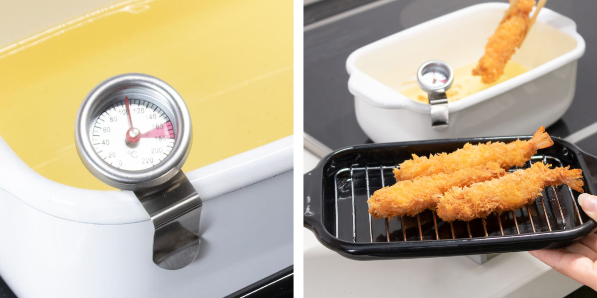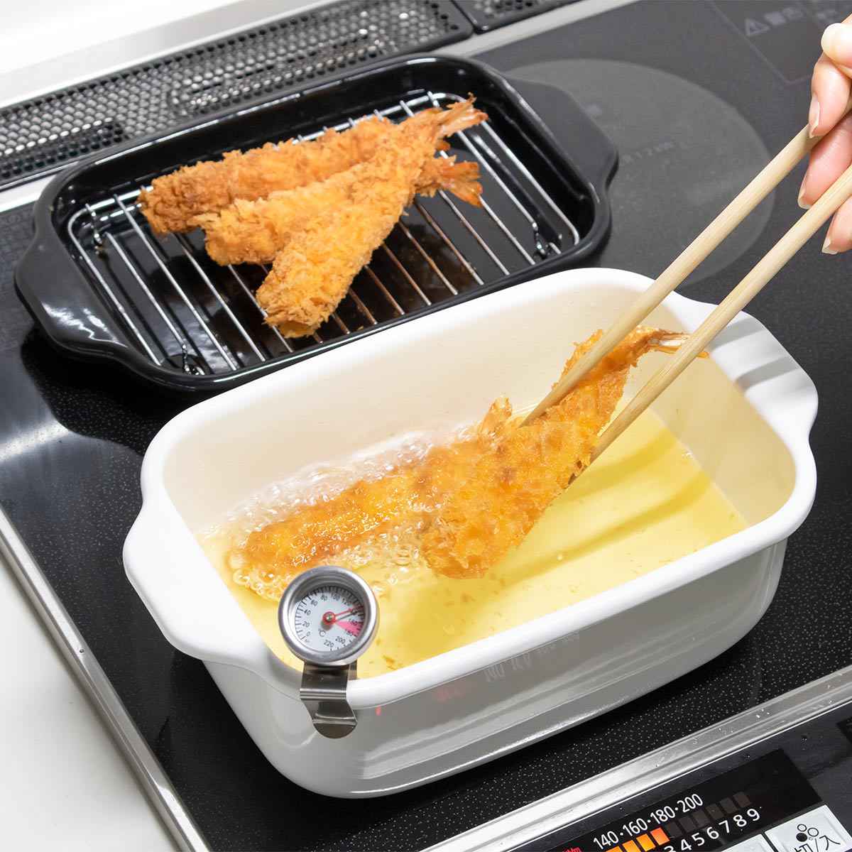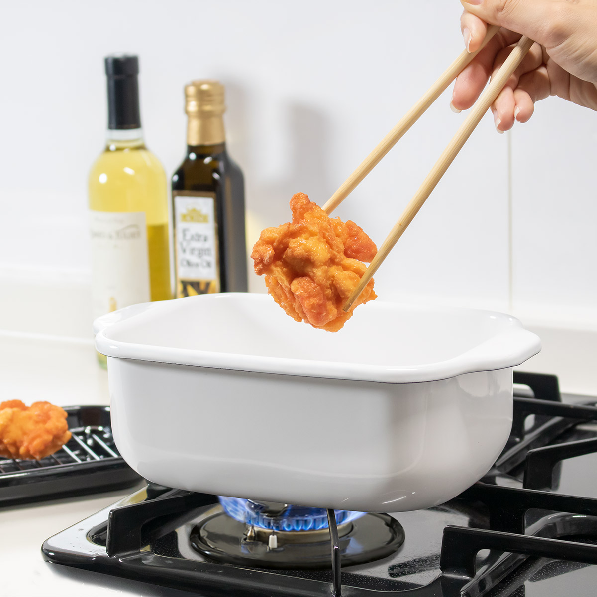 四角い形は、アスパラガスやエビフライのような長い食材の調理にぴったり。少ない油で揚げ物に十分な深さを確保できるのも嬉しいポイントです。