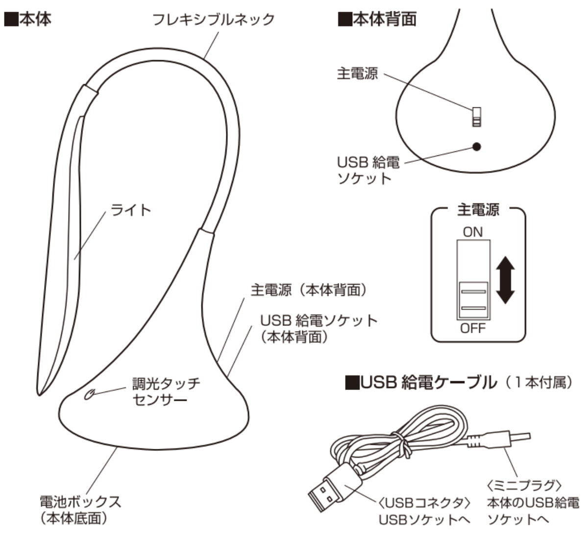 | サイズ | ライトを垂直に伸ばした最大値:約10.5×11.5×47cm 台座:約10.5×11.5×11cm ライト:約4.5×2×19cm ネック:約17cm |