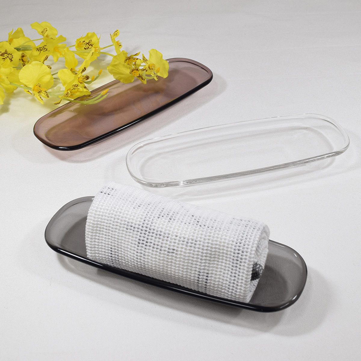 おしぼり以外にも小物トレーやメガネトレーとしても使えます。洗面所では、洗顔時にメガネやアクセサリーの一時置きとして、玄関では、鍵置き場としても便利も使えます。