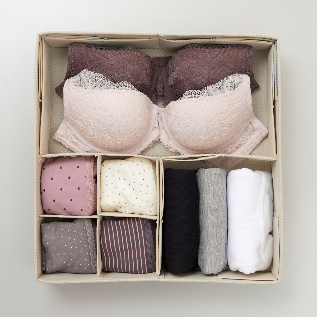 仕切りを自由に動かせる収納ボックスです。引き出し内で散らかりがちな靴下や下着も、この収納ボックスを使えばすっきりと整頓できます。仕切りによる区分けで、見た目がきれいになるだけでなく、片付けやすく取り出しやすい状態に。快適な整理整頓を実現するアイテムです。