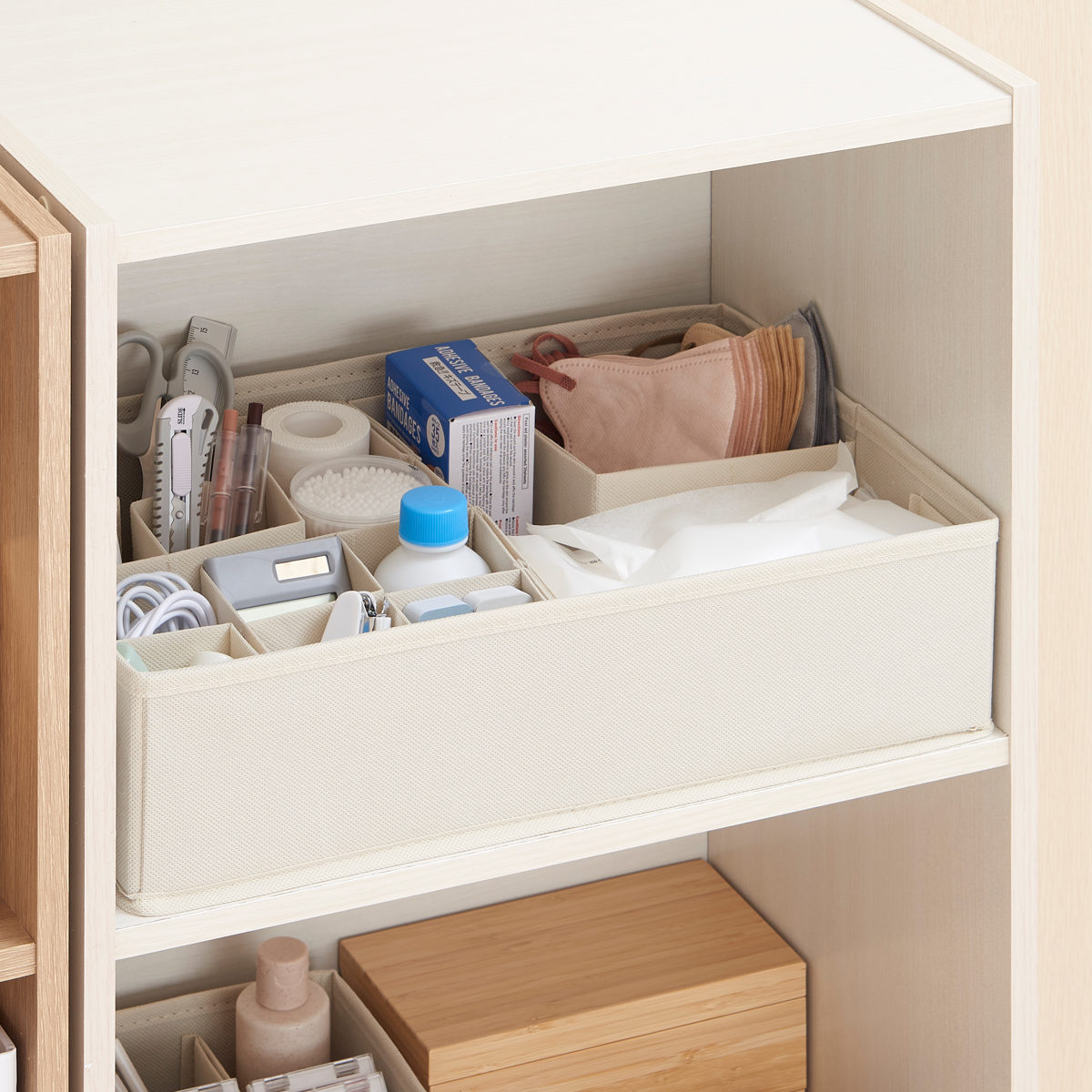 Lサイズはカラーボックスにピッタリ収まるサイズです。靴下やハンカチなどの細かい物の整頓や薬箱としても最適です。