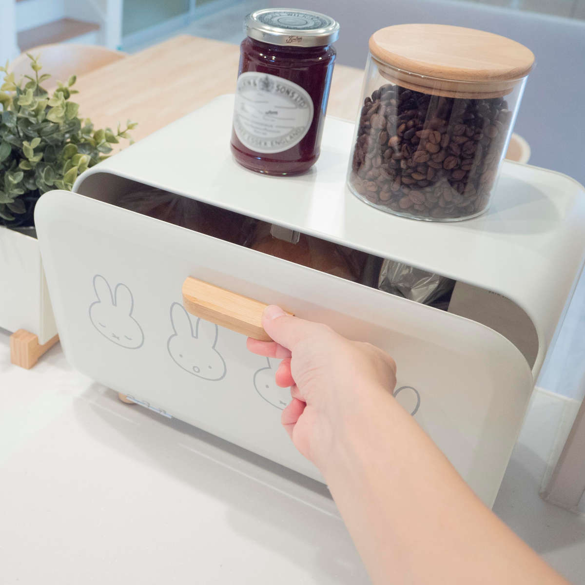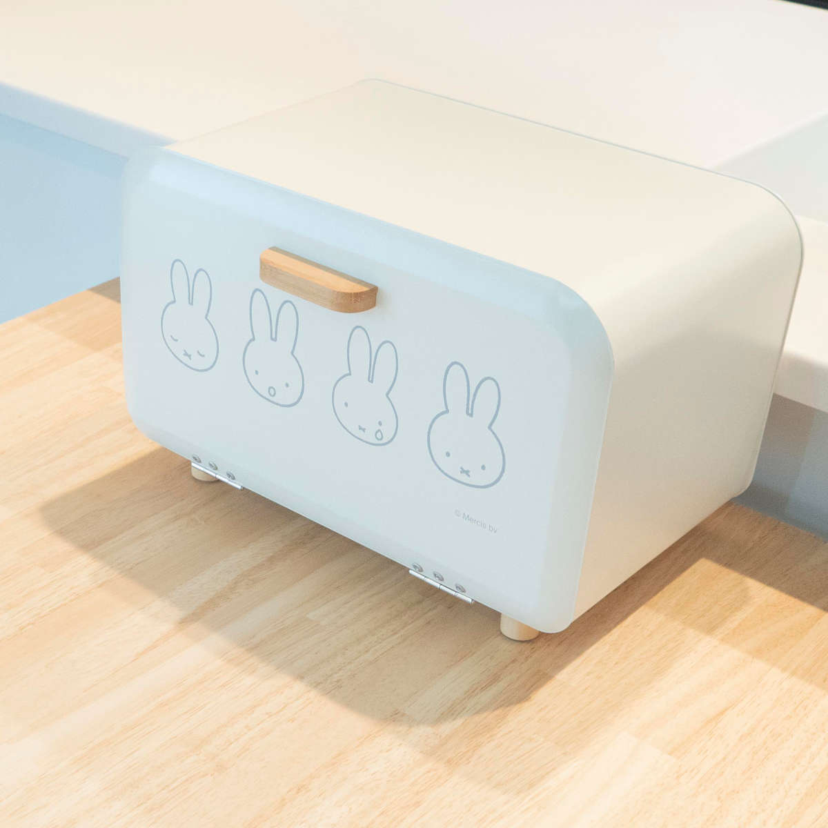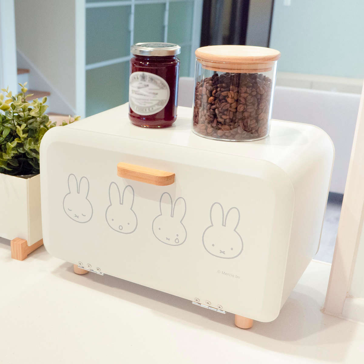 パンやお菓子など生活感が出やすいキッチン周りをスッキリ片付けられるブレッドケースです。優しいカラーのミッフィーフェイスと、脚の天然木×ホワイトのナチュラルな配色で、インテリアに馴染みやすいデザインです。